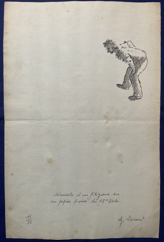 1986 [Bruxelles, Lebeer-Hossmann, 1986].31,5 x 20,5 cm, estampe sur papier vergé ancien.Estampe originale, titrée, signée et numérotée 11/25 par Christian Zeimert. Le feuillet, en papier ancien, comporte un filigrane en son centre, sur lequel l'artiste fait se pencher un personnage curieux.Excellent état.