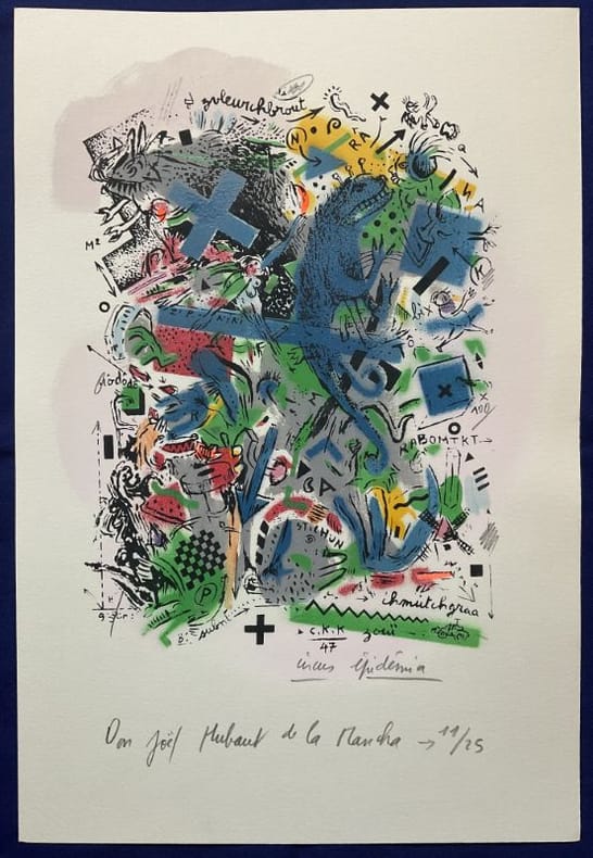 1986 [Bruxelles, Lebeer-Hossmann, 1986]. 37 x 25 cm, technique mixte (sérigraphie, aérographe, crayon) sur papier à dessin. Oeuvre originale, titrée, numérotée 11/25 et signée "Don Joël Hubaut de la Mancha". Excellent état.