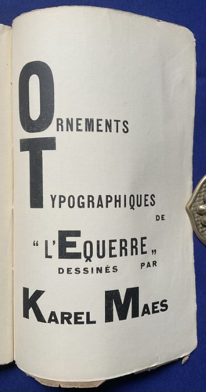 [Bruxelles, l'Équerre, 1923]. 23,5 x 15,5 cm, 219-2-[3] bl. pp. : ill. Broché, couverture typographique d'édition. Petit manque au dernier plat, quelques marques d'usure à la couverture, bel état général. Édition originale, avec ornements typographiques du jeune Karel Maes (1900-1974) au moment où il découvre la quintessence de son langage pictural dans l'abstraction géométrique.