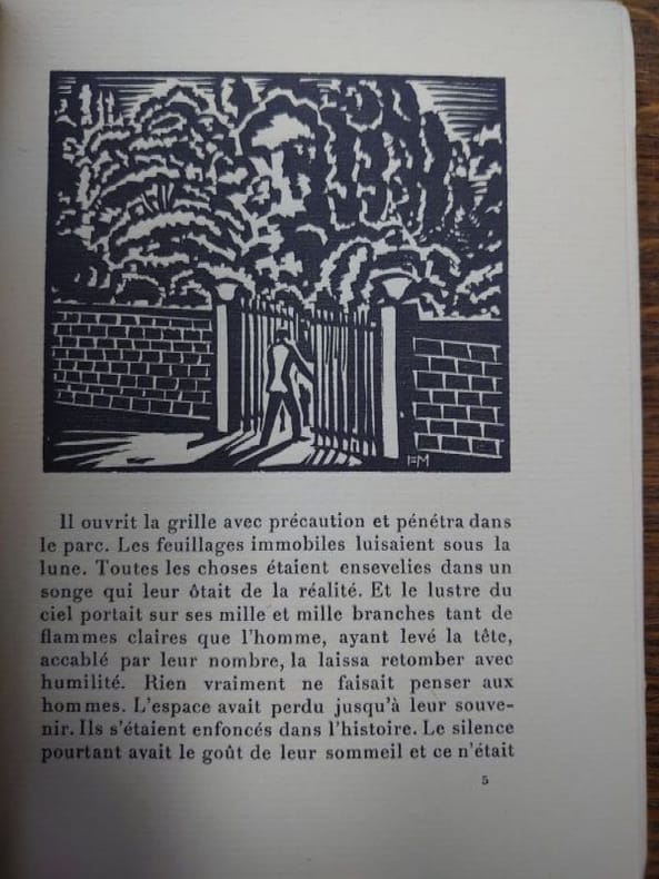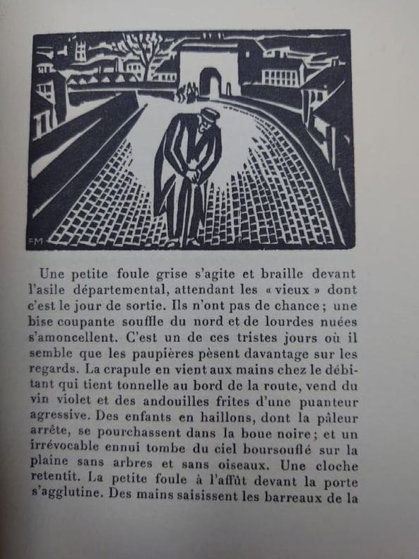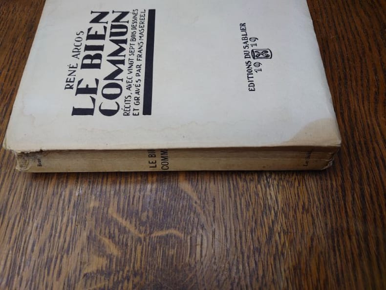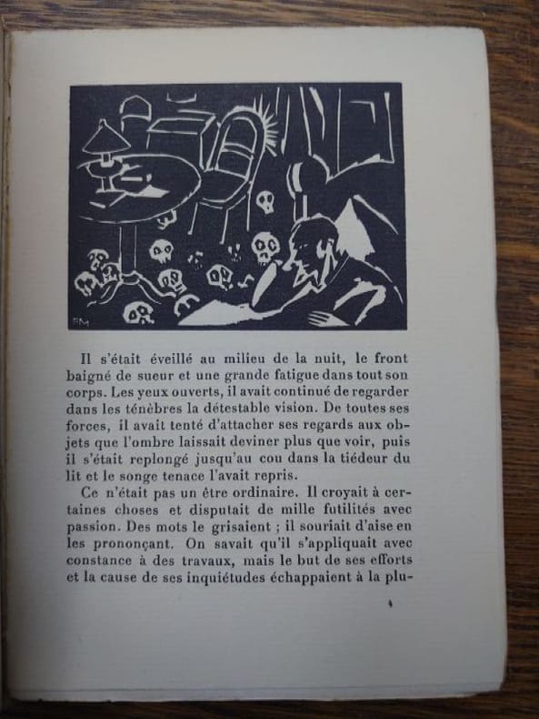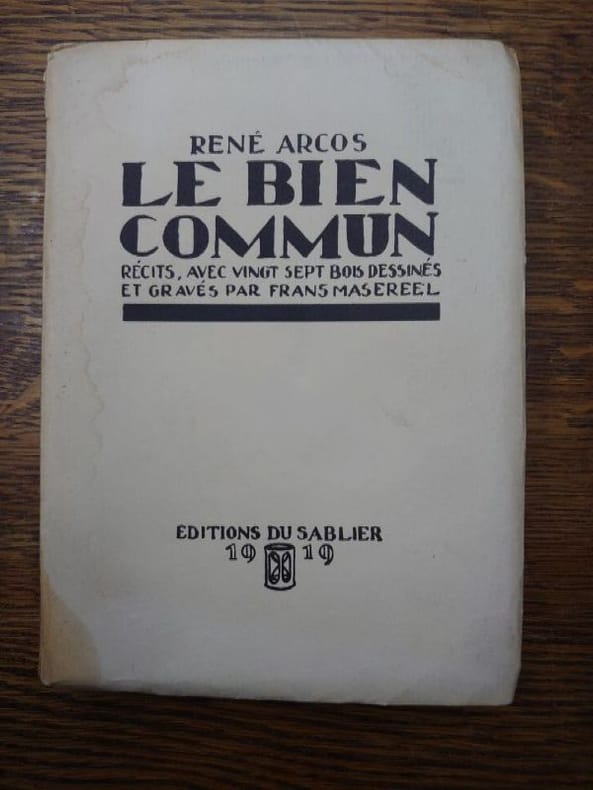 Genéve Edition du Sablier 1919 in-12 broché un volume, broché blanc in-douze carré Editeur (paperback in-12 Editor (17,3 x 12,4 cm), dos et couverture rempliée imprimés en noir, toutes tranches non-rognées, Exemplaire du Tirage limité, un des 750 Exemplaires sur vergé volumineux anglais (Exemplaire N° service) service écrit à la main à l'encre bleue par l'éditeur, orné de Vingt Sept Bois in-texte en noir Dessinés et Gravés Par Frans Masereel, 185 pages, 1919 [Genève] (Suisse) Edition du Sablier Editeur + joint avec : le bulletin de souscription dépliant de l'Editeur avec un bois specimen de Frans Masereel,
