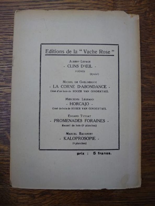 Bruxelles, Éditions de la Vache Rose, 1925. 20 x 14 cm, 44 pp. Broché, couverture légèrement usée sinon bon exemplaire. Édition originale, un des 200 ex. num. sur Featherweight.