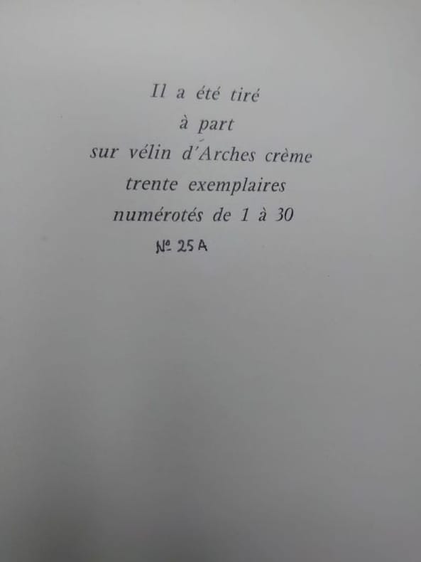 Lyon, Armand Henneuse, 1959. 19 x 14 cm, 72 pp. Broché, couverture décollée mais ouvrage en bel état. Édition originale, un des 30 ex. num. sur vélin d'Arches crème. Seul grand papier.