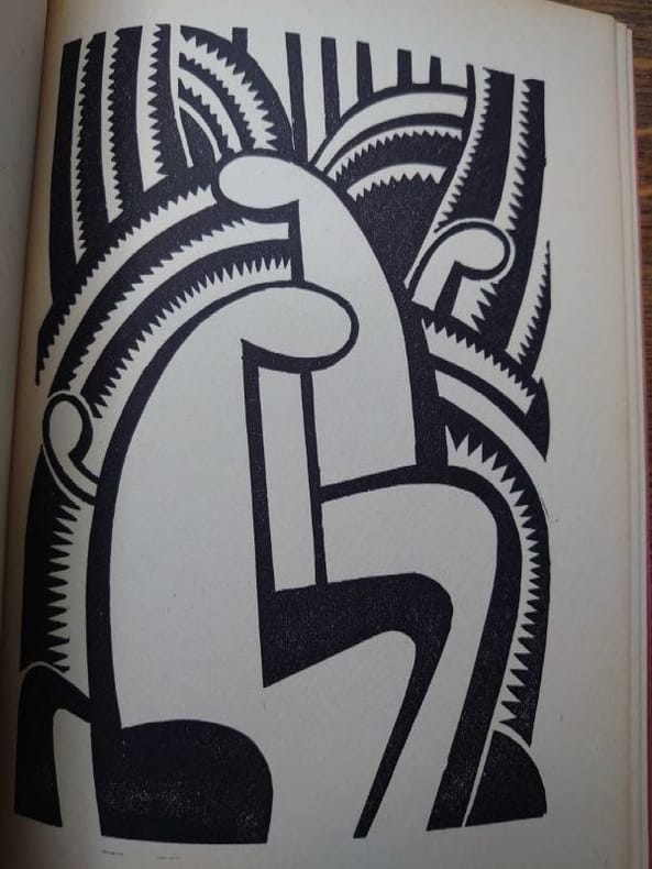 7. Bruxelles, éditions L'Equerre, 1917, 22 x 15,5 cm, 86 pp, avec 9 linos pleine page de Flouquet et une photogravure h.t., broché, couverture originale, dos endommagé avcec perte de papier. Avec une dédicace manuscrite de l'auteur à Roger Avermaete datée 5 sept. 1928..