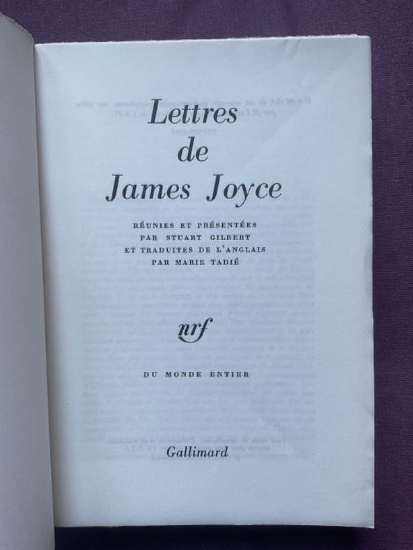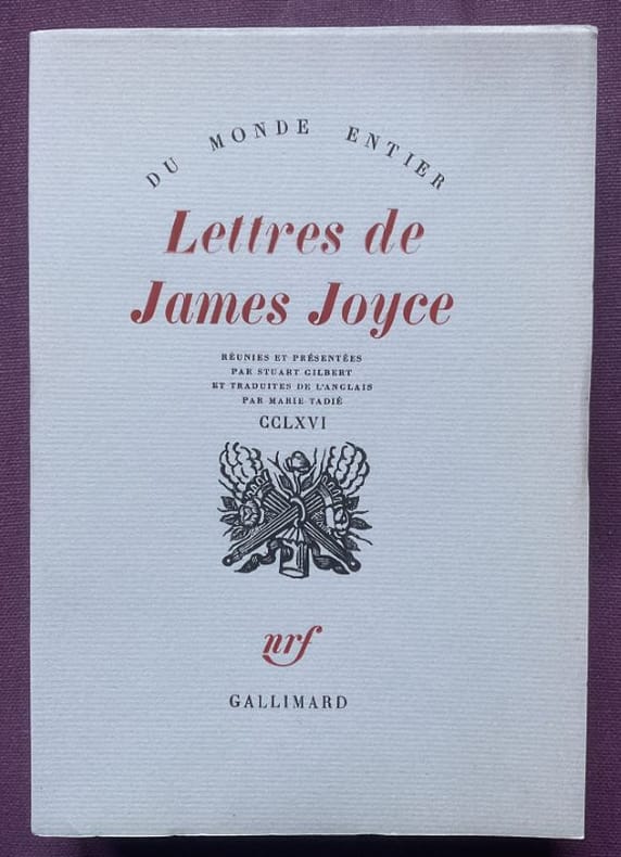 Coll. "Du monde entier", Paris, éd. Gallimard, 26 octobre 1961, Première Edition en français après 47 grands papiers, fort in-8, cartonnage souple éd., 552 pp., lettres réunies et présentées par Stuart Gilbert, traduction par Marie Tadién table des lettres, 426 lettres écrites par James Joyce écrites pendant les trente-cinq années d'exil volontaaire de l'auteur. Pas courant Bon état du papier, la couverture est très légèrement défraîchie