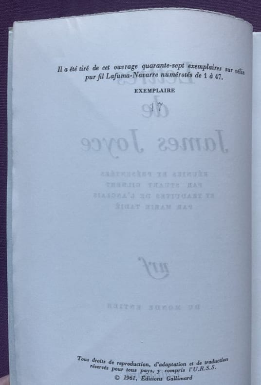 Réunies et présentées par Stuart Gilbert et traduites de l'anglais par Marie Tadié. Paris, NRF, Gallimard, Collection Du monde entier, 1961. 21 x 14,5 cm, 548 pp. Broché, non coupé. Édition originale, 1/47 ex. num. sur vélin pur fil, seul grand papier. Excellent état.