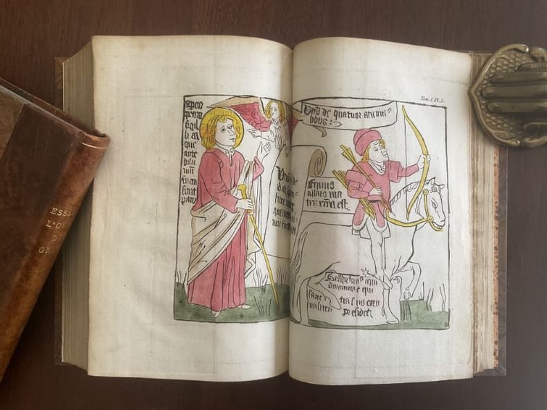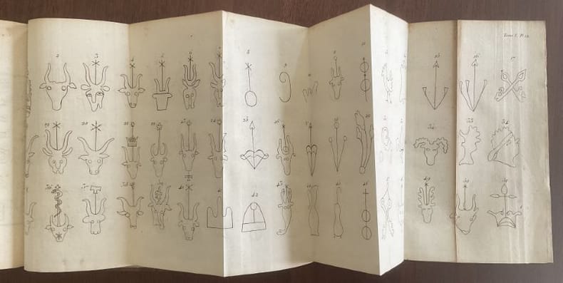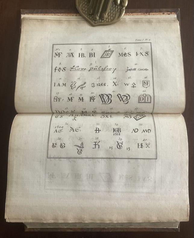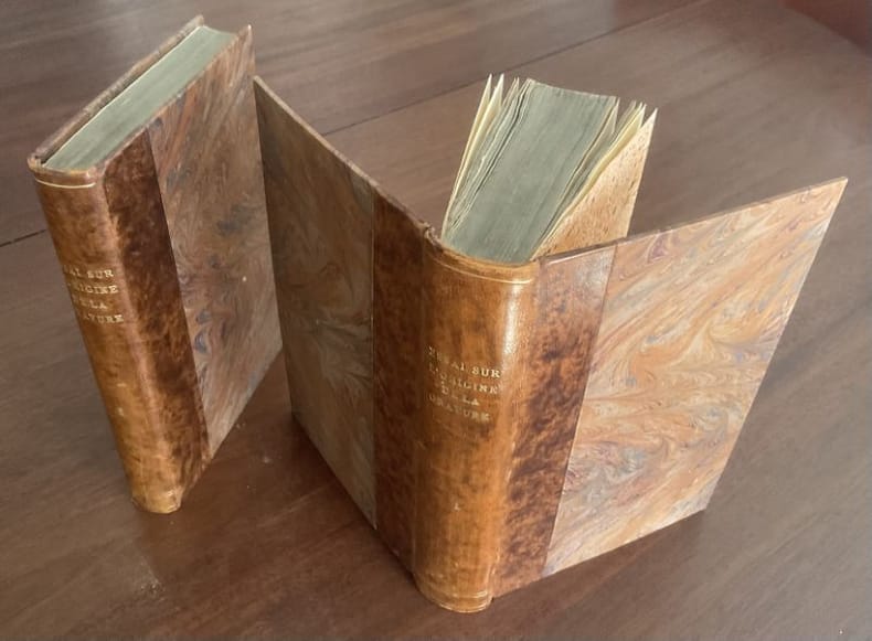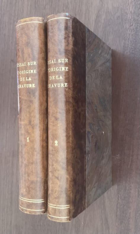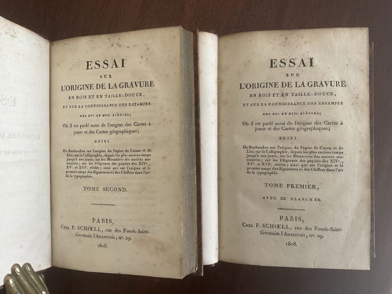 Paris, chez F. Schoell, 1808. 19,5 x 12,5 cm, [8]-ii-4-[2]-404-[4] pp., [20] ff. de planches gravées, numérotés 1 à 19 (avec un 9bis) ; [4]-372-[2] pp. Deux volumes reliés de même, demi-veau marbré serti par un filet à froid, plats en papier marbré, dos lisse avec titre, tomaison et filets dorés, tranches jaspées de bleu. Édition originale, la seule jamais parue, exemplaire complet en deux tomes avec les vingt planches gravées, la plupart dépliantes, l'une rehaussée. Étude précoce sur le sujet par l'éditeur-imprimeur néerlandais Hendrik Janssen (1741-1812), alors bibliothécaire de Talleyrand, dédicataire de cet ouvrage. En outre, précieuse documentation sur les filigranes anciens. Exemplaire en très bon état et agréablement relié.