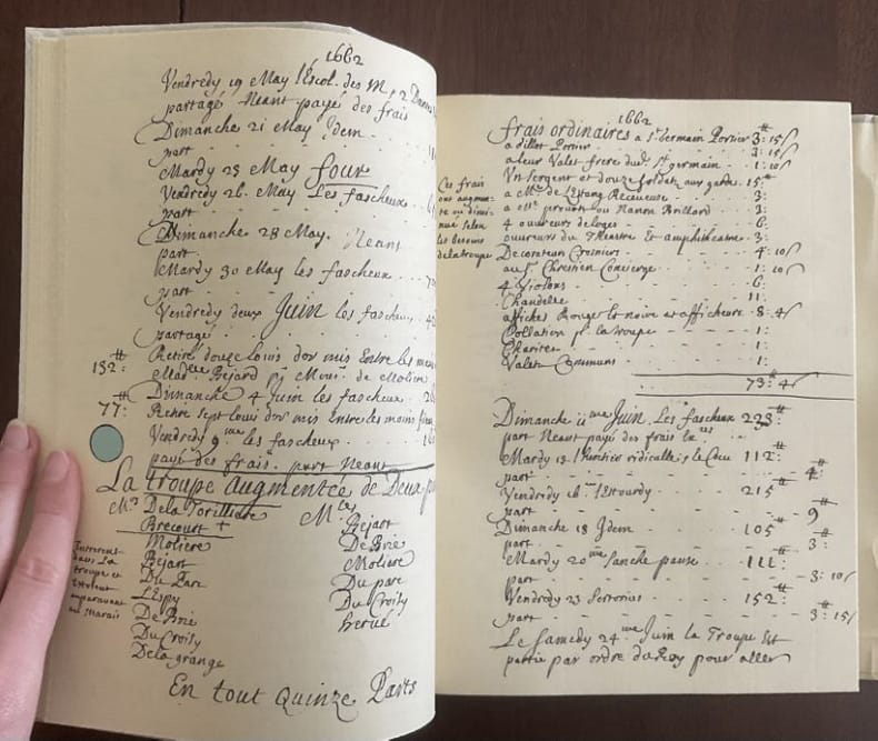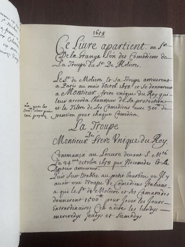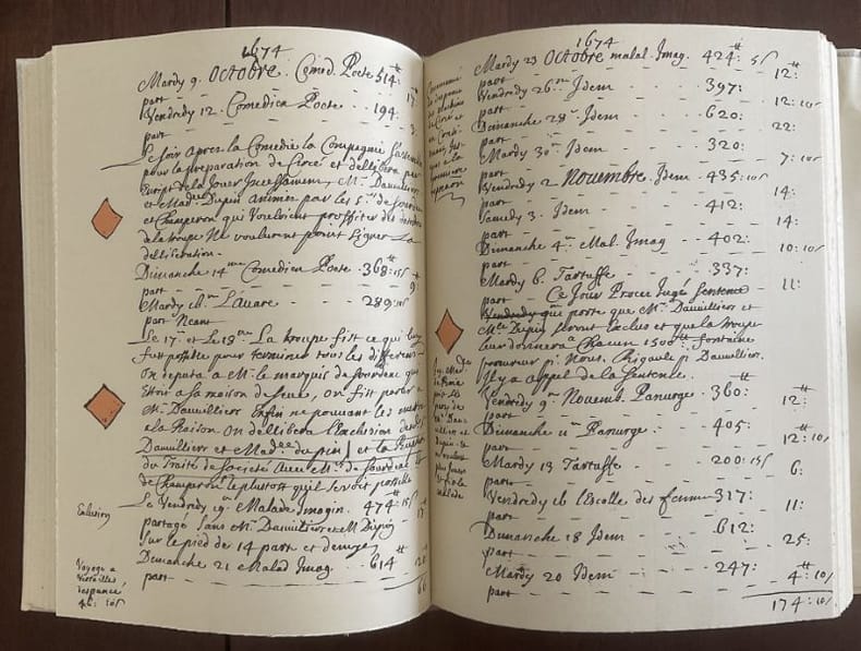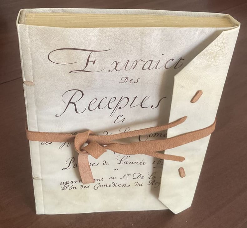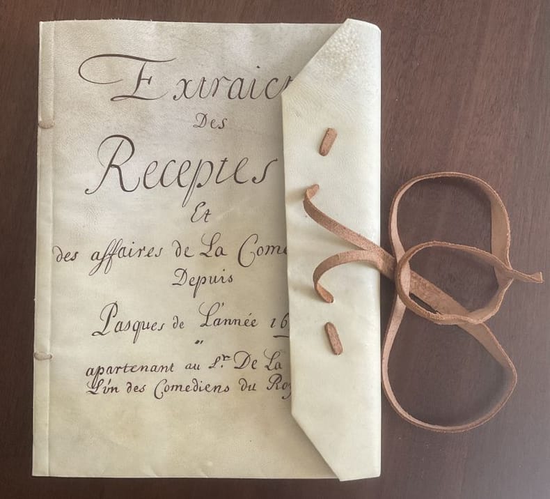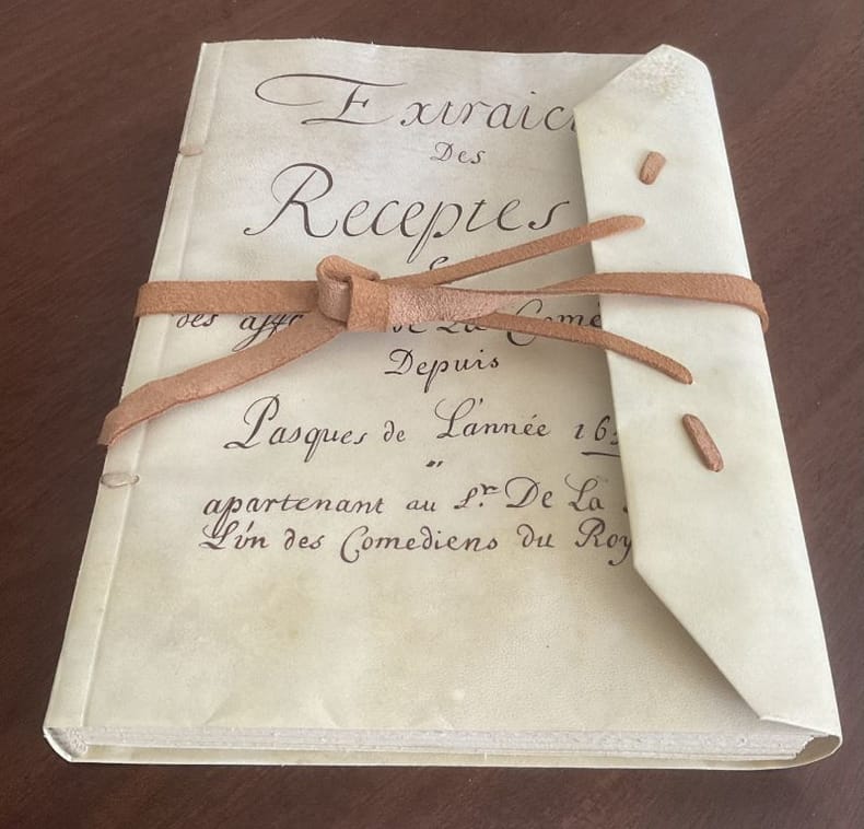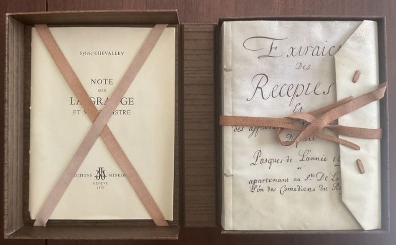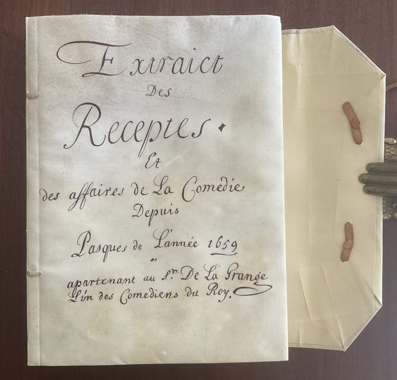 Genève, Éditions Minkoff, 1972.25 x 18,5 cm, non paginé. Relié, plein vélin souple à un rabat, titre calligraphié au premier plat, fermeture au moyen d'une lanière de cuir fauve. Avec : un fascicule de présentation / documentation illustré de 28 pp., broché, le tout dans l'emboîtage d'édition en beau bois sombre, vignettes au premier plat et au dos (petite fente mineure, sans manque).Luxueuse édition en fac-simile de l'un des documents les plus célèbres de l'histoire du théâtre français, car il est un témoignage de première main exceptionnel sur Molière et sa troupe, réalisé pour le tricentenaire de la mort du dramaturge. Fac-simile remarquable par sa qualité et l'emploi de matériaux précieux (vélin, vergé épais, bois, lanières de cuir) pour obtenir un rendu au plus proche du véritable registre... Bluffant.Bien complet avec le fascicule "Note sur La Grange et son Registre" par Sylvie Chevalley, dans l'emboîtage d'origine, en très bel état.Il n'est pas fait mention de tirage, que nous pensons être à très petit nombre : l'ouvrage est fort rare (introuvable !).
