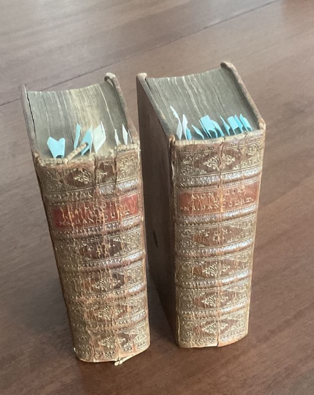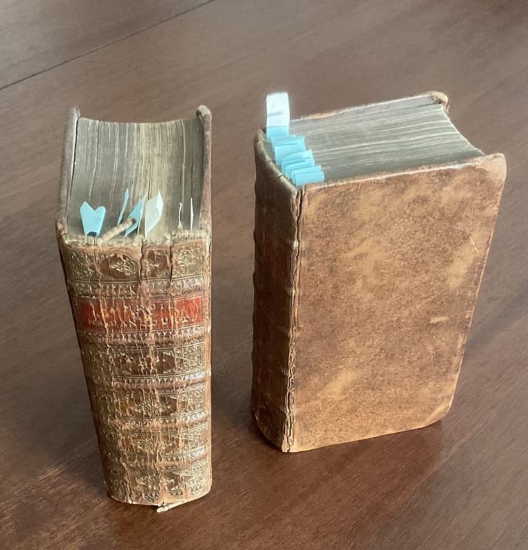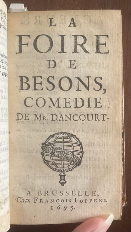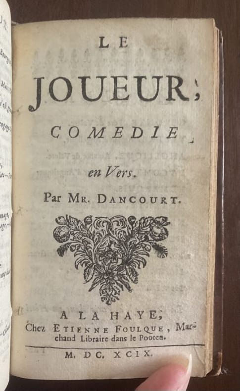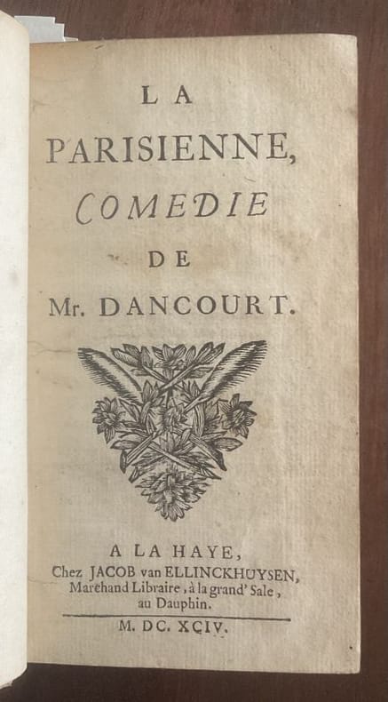 Éditeurs et dates divers.14 x 8 cm, 2 volumes reliés de même, plein veau moucheté, dos à 5 nerfs richement orné avec pièce de titre rouge, tomaison, tranches jaspées.Deux recueils, très probablement constitués par un amateur, rassemblant 25 pièces dans des éditions contemporaines de l'auteur, dans des reliures du temps. Jean Carton Dancourt (1661-1725), avocat de formation, fut acteur et auteur pour la Comédie française de comédies de moeurs en un acte à sujet d'actualité. Ces "dancourades" le placent comme un précurseur important du vaudeville moderne. L'histoire éditoriale des pièces de théâtre de cette époque est amphigourique, les éditions parallèles et éditions pirates pléthore... D'après nos informations, la plupart des éditions originales de Dancourt furent publiées par Guillain. Nous avons ici deux pièces éditées l'année de la création et de l'originale chez un autre éditeur, Foppens, à Bruxelles (soit-disant), probablement pirates, dont nous n'avons trouvé la trace dans aucune vente ni bibliothèque (La Foire de Besons, Le Tuteur).Par ailleurs, la dernière pièce du premier volume, Le Joueur, d'abord parue anonymement chez Guillain en 1697, et aujourd'hui attribuée à Jean-François Regnard (1655-1709), est ici éditée par Étienne Foulque à La Haye en 1699 avec pour nom d'auteur Dancourt, comportant la même préface que dans l'originale.Contenu du premier volume : - La Parisienne. La Haye, chez Jacob van Ellinckhuysen, M.DC.XCIV [1694].- La Foire de Besons. Brusselle, chez François Foppens, 1695.- Le Tuteur. Brusselle, chez François Foppens, 1695.- Les Bourgeoises à la mode. La Haye, chez Étienne Foulque, M.DC.XCVI [1696].- L'Opéra de village. La Haye, chez Étienne Foulque, M.DC.XCVI [1696].- La Maison de campagne. La Haye, chez Étienne Foulque, M.DC.XCVI [1696].- L'Été des coquettes. La Haye, chez Étienne Foulque, M.DC.XCVI [1696].- Les Vendanges. La Haye, chez Étienne Foulque, M.DC.XCVI [1696].- Le Notaire obligeant. La Haye, chez Étienne Foulque, M.DC.XCVI [1696].- Les Curieux de Compiègne. La Haye, chez Étienne Foulque, M.DC.XCIX [1699].- Le Joueur. La Haye, chez Étienne Foulque, M.DC.XCIX [1699].Contenu du second volume : un ensemble de pièces parues à La Haye, chez Étienne Foulque, en 1705 :Le Moulin de Javelle - Nouveau prologue et nouveaux divertissemens pour la comédie des Amans magnifiques - Les Vacances - La Foire Saint-Germain ) Les Eaux de Bourbon - Le Galand jardinier - Les Trois Gascons - Angélique et Médor - Nouveau prologue et nouveaux divertissemens pour la comédie de l'Inconnu - Le Retour des officiers - Les Enfans de Paris - Je vous prends sans verd - La Lotterie - La Matrone d'Éphèse. Très bon état intérieur, les reliures présentes quelques marques d'usure mineures.