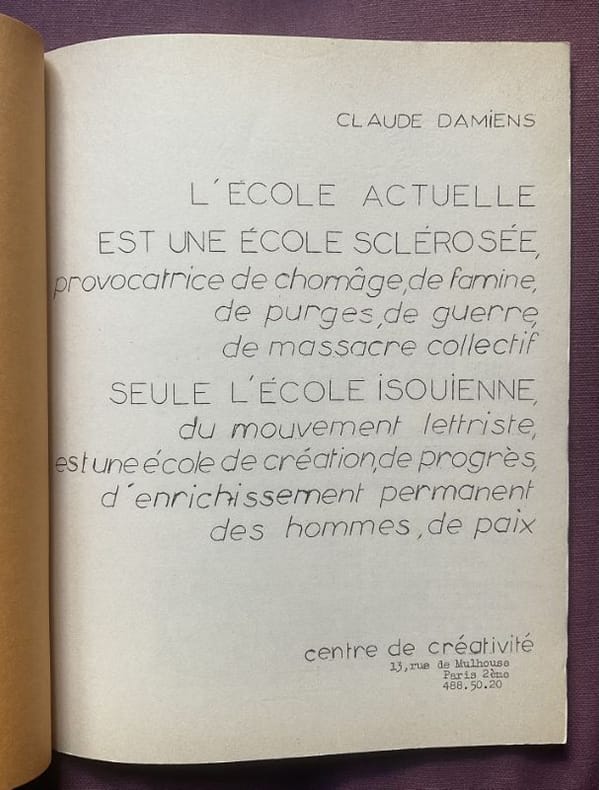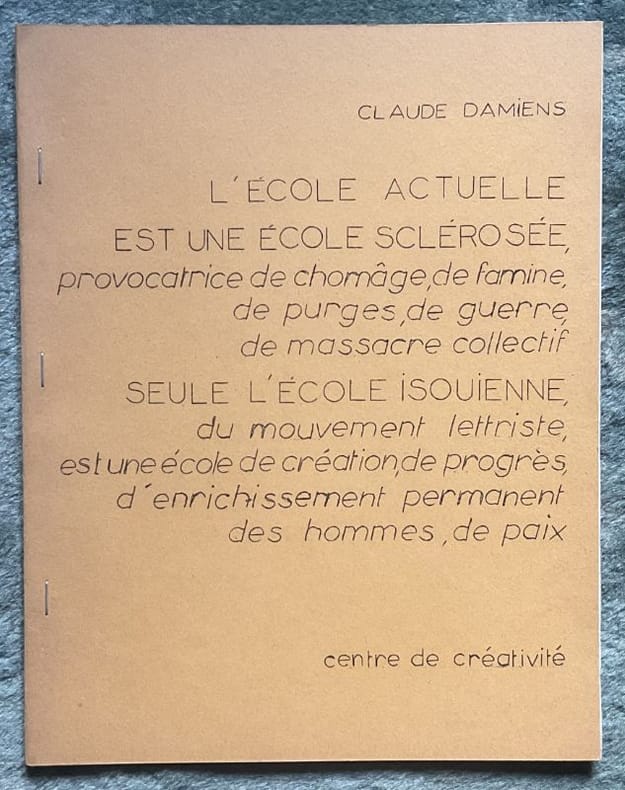 Paris, Centre de créativité, s.d. [1967].27 x 21 cm, [1]-5-[5] feuillets ronéotypés recto. Broché, agrafes.Édition originale sans mention de tirage. "Contre les écoles d'imposture, qui ne sont citées nulle part, contre les universités où enseignent des maîtres pompiers sclérosés, - imposteurs semblables en tous points, aux curés scolastiques d'autrefois - contre les faussaires du Savoir et de la pédagogie, tous les partisans de la novation authentiques, élèves, parents, professeurs honnêtes, viendront s'instruire ou enverront les personnes dont ils ont la responsabilité à s'instruire à l'Université des créateurs fondée par le mouvement lettriste".De toute rareté.Exceptionnel état de conservation, comme neuf.