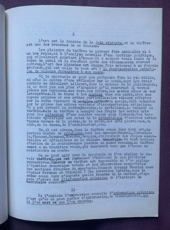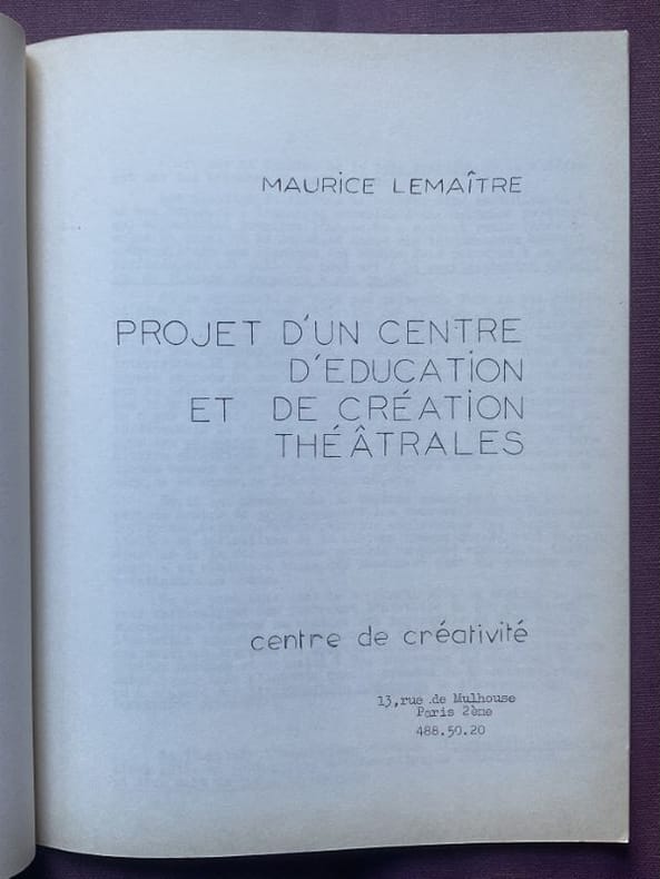 Paris, Centre de créativité, s.d. [1967].27 x 21 cm, non paginé, [13] feuillets ronéotypées recto. Broché, agrafes.Édition originale sans mention de tirage. Texte manifeste de Lamaître sur le théâtre, et présentation du groupe "Théâtre neuf", dont il est fondateur.De toute rareté.Exceptionnel état de conservation, comme neuf.