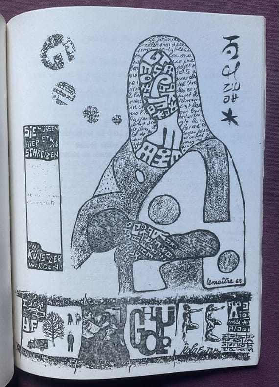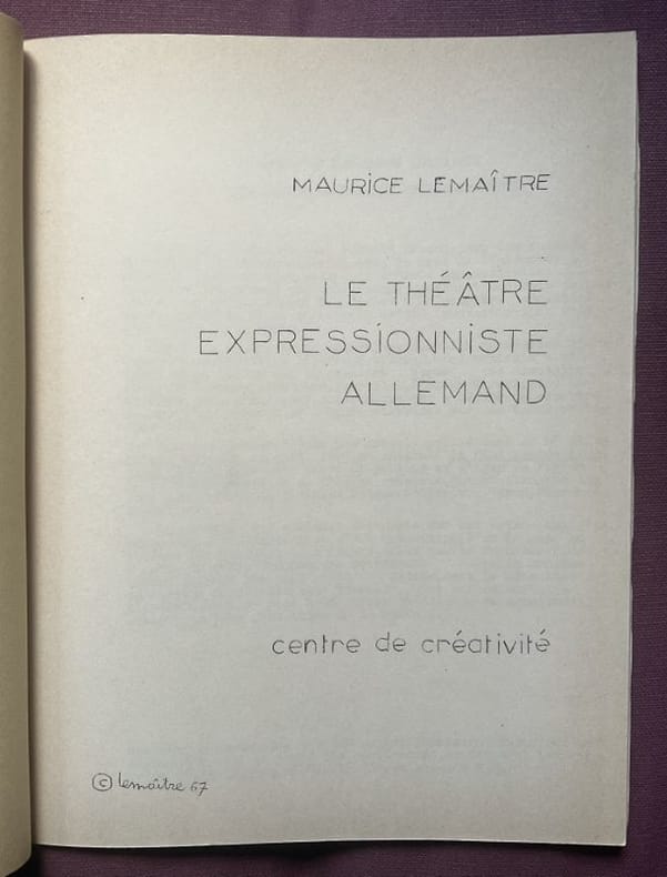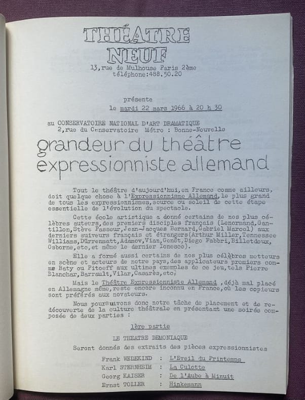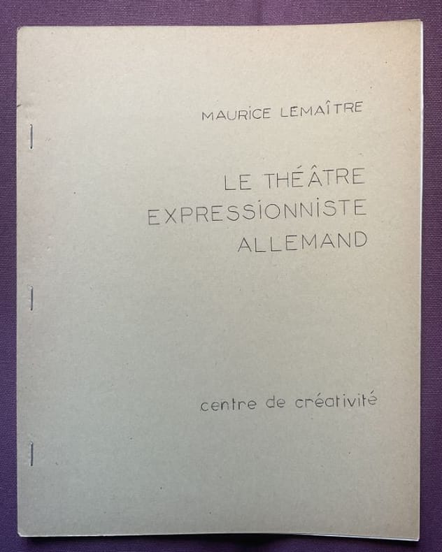 Paris, Centre de créativité, 1967. 27 x 21 cm, non paginé, environ 40 pages ronéotypées recto. Broché, agrafes. Édition originale sans mention de tirage. Il y est entre autres question la soirée de présentation par le "Théâtre neuf", fondé par Lemaître, de la soirée "Grandeur du théâtre expressionniste allemand" et d'une bibliographie sur ce thème. Une illustration en noir à pleine page de Lemaître. De toute rareté. Exceptionnel état de conservation, comme neuf.
