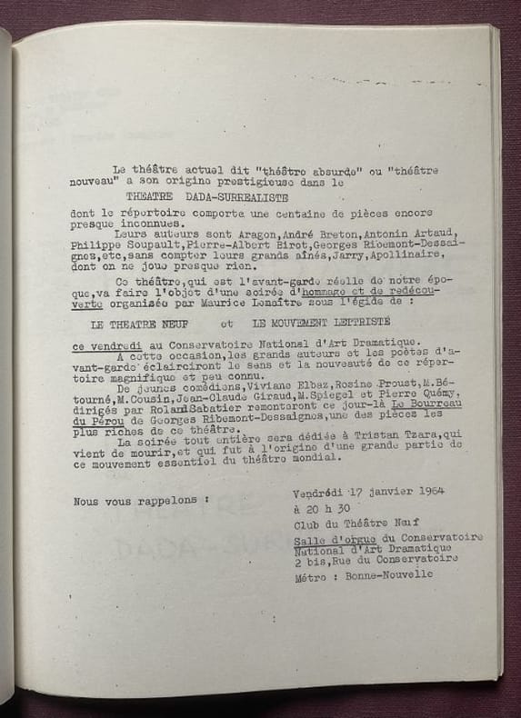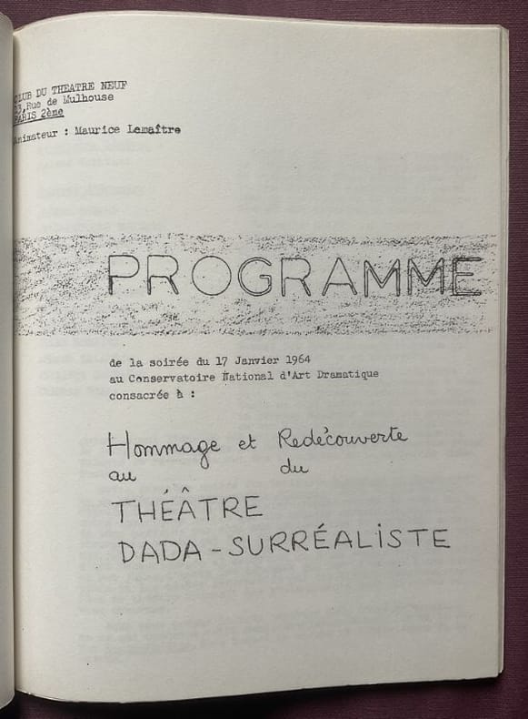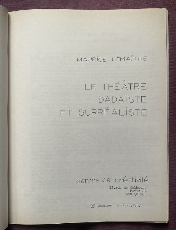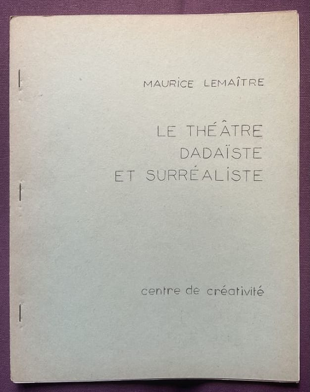 Paris, Centre de créativité, 1967. 27 x 21 cm, non paginé, environ 50 pages ronéotypées recto. Broché, agrafes. Édition originale sans mention de tirage. Il y est entre autres question du groupe "Théâtre neuf", fondé par Lemaître, et d'une tentative de "Première bibliographie du répertoire dadaïste et surréaliste". Catalogue des publications in fine. De toute rareté. Très légère insolation près du dos, sinon très bon état.
