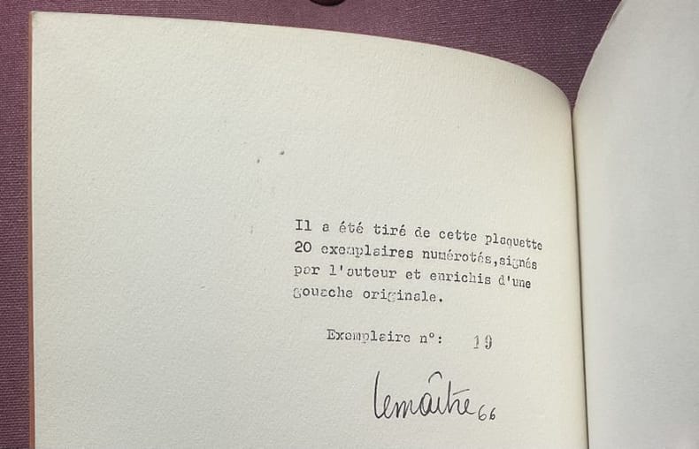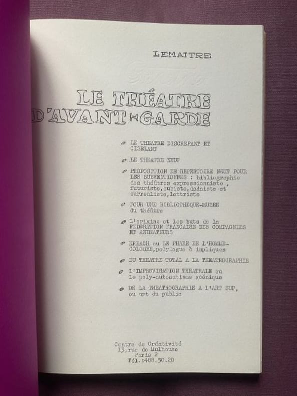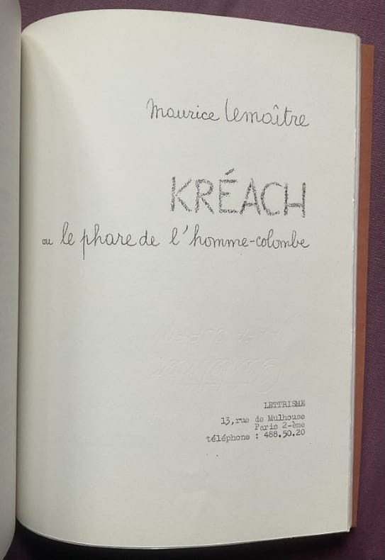 Paris, Centre de créativité, 1966. 27 x 21 cm, non paginé, environ 100 pages ronéotypées recto, et une gouache originale. Broché. Édition originale, un des 20 exemplaires de tête numérotés et signés par Lemaître, accompagné d'une gouache originale de l'artiste sur papier rose, brochée en frontispice. N° 10 mai-juin de "Lettrisme". Catalogue des publications in fine. De toute rareté. Exceptionnel état de conservation, le livre semble n'avoir jamais été ouvert.
