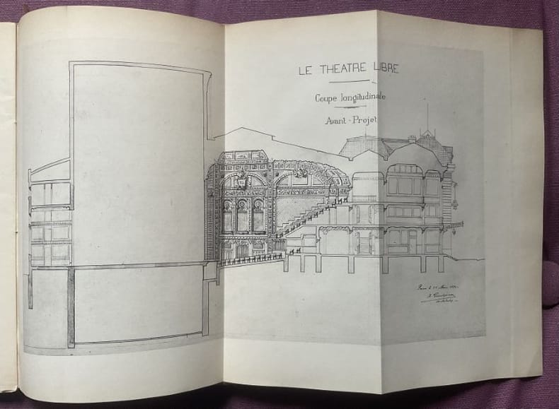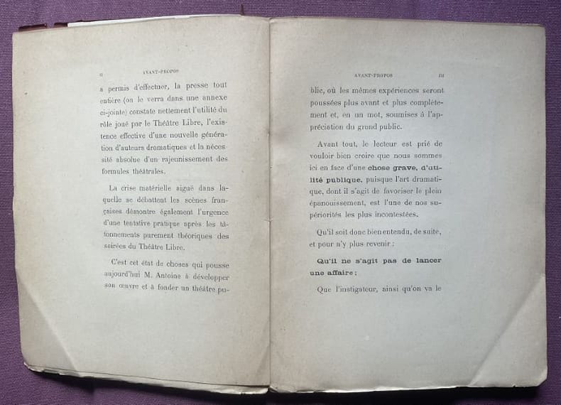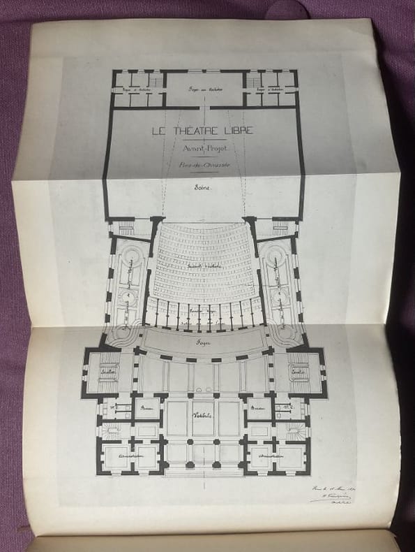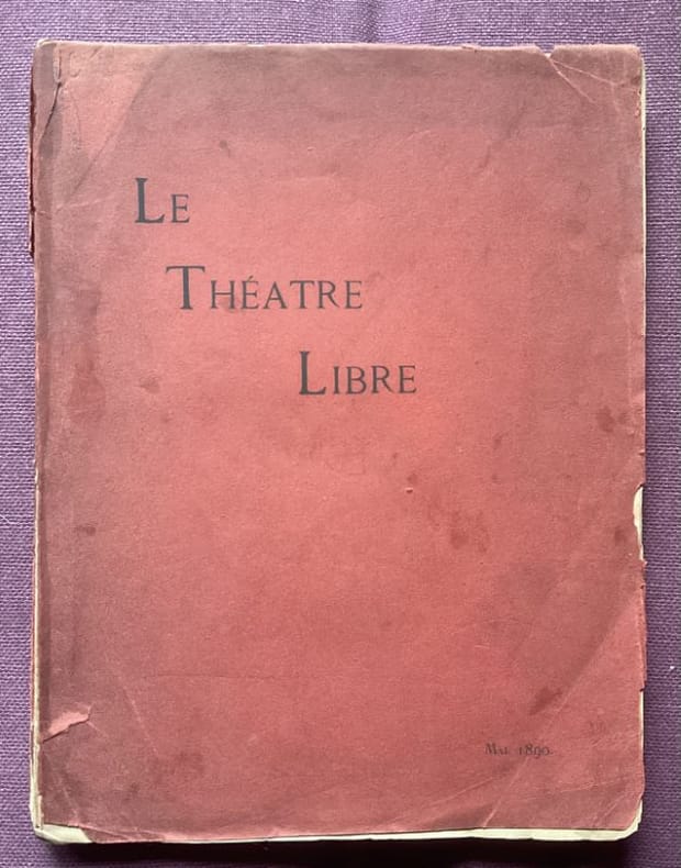 [Paris], sans nom d'éditeur [Théâtre Libre], mai 1890. 20 x 15,5 cm, 186 pp., puis quelques feuillets avec les budgets des années précédentes et la table. Broché. Édition originale, rarissime, sur l'une des compagnies théâtrales qui ont marqué la fin du XIXe siècle. André Antoine (probablement aux commandes de cette édition) fut un pionnier de la mise en scène "naturaliste" et celui qui fit découvrir en France Ibsen, Strindberg, Tolstoï... Ce texte est très précoce, le Théâtre Libre existant depuis seulement trois ans lors de sa parution, et ainsi un témoignage de première main sur les théories, l'histoire, le répertoire, les projets, et l'économie de cette compagnie, y compris le plus trivialement avec données financières à l'appui. Planches dépliantes avec plans de lieux théâtraux en projet.L'intérieur de l'ouvrage est en bon état, mais la couverture très abîmée, dos et mors fendus, taches. Une mouillure sur le dernier plat a atteint le dernier feuillet blanc et la table, uniquement. On excuse ces défauts par la parfaite lisibilité de l'ouvrage et son caractère remarquable et introuvable. On joint, du même : Mes souvenirs sur le Théâtre Antoine et sur l'Odéon. Paris, Grasset, 1928.
