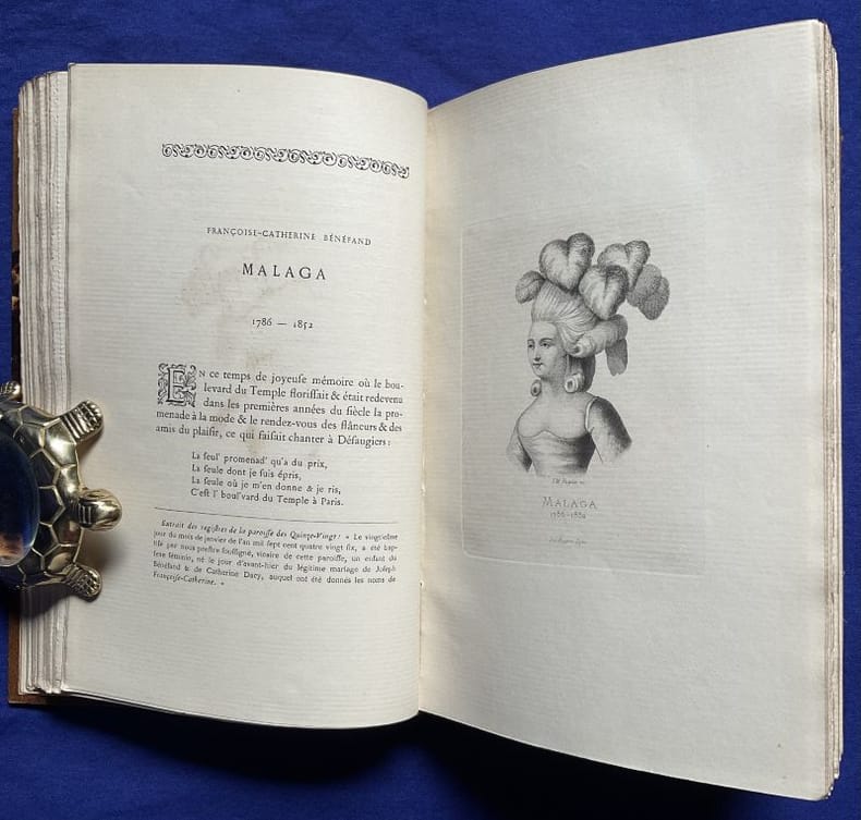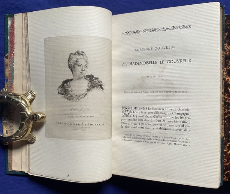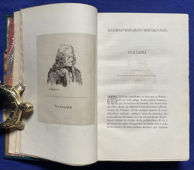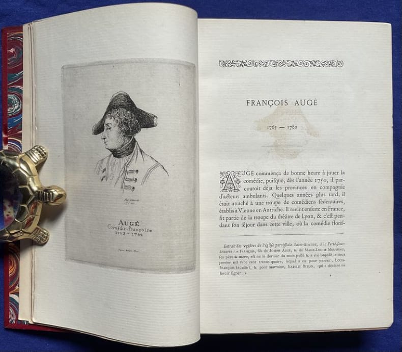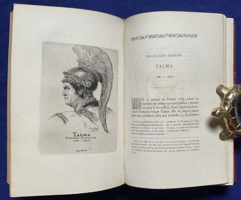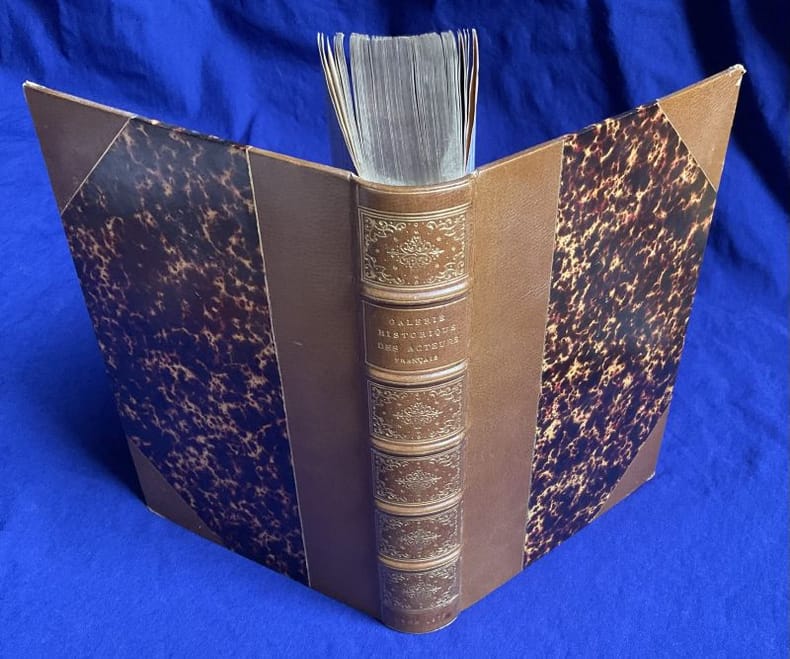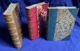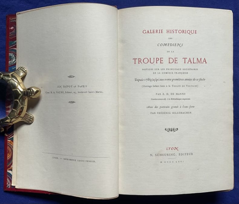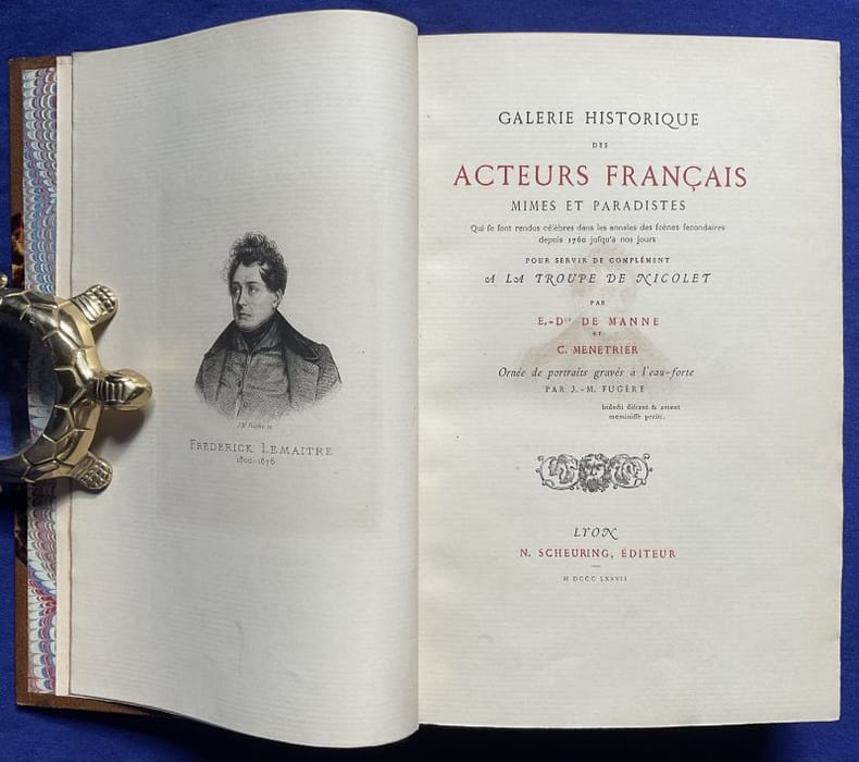 MANNE E[dmond] D[enis] de. Galerie historique des portraits des comédiens de la troupe de Voltaire. Gravés à l'eau-forte, sur des documents authentiques par Frédéric Hillemacher. Avec des détails biographiques inédits. Lyon, M. [Nicolas] Scheuring, MDCCCLXI [1861].21,5 x 15 cm, IX-[3]-351-[3] p., ff de pl. Relié, demi-chagrin turquoise à coins sertis d'un filet doré, dos à 5 nerfs richement orné, titre et millésime dorés, tête dorée. Reliure signée de David.Édition originale, tirage limité à 250 ex. num., celui-ci sur vergé, avec des portraits à l'eau-forte par Frédéric Hillemacher. Bel exemplaire, très léger transfert des gravures sur la page en vis-à-vis, rousseurs limitées aux feuillets blancs en début et fin de volume, dos passé.[IDEM]. Galerie historique des comédiens de la troupe de Talma. Notices sur les principaux sociétaires de la Comédie Françoise depuis 1789 jusqu'aux trente premières années de ce siècle (ouvrage faisant suite à la Troupe de Voltaire. Avec des portraits gravés à l'eau-forte par Frédéric Hillemacher.Lyon, M. [Nicolas] Scheuring, MDCCCLXVI [1866].21,5 x 15 cm, IX-[3]-436-[4] p., ff. de pl. Relié, demi-chagrin cerise à coins sertis d'un filet à froid, dos à 5 nerfs richement orné, titre, nom du collectionneur et millésime dorés, tête dorée. Reliure signée de L. Claessens. Édition originale, illustrée de portraits à l'eau-forte par Frédéric Hillemacher. Ex-libris au 1er contre-plat. Dos légèrement passé, quelques marques de frottements, épidermures sur les coins, excellent état intérieur, habituel léger transfert des gravures sur la p. en vis-à-vis.[IDEM & MENETRIER C.]. Galerie historique des acteurs français mimes et paradistes qui se sont rendus célèbres dans les annales des scènes secondaires depuis 1760 jusqu'à nos jours. Pour servir de supplément à La Troupe de Nicolet. Ornée de portraits gravés à l'eau-forte par J.-M. FugèreLyon, M. Scheuring, MDCCCLXXVII [1877].22 x 15 cm, VIII-384 p., ff. de pl. Relié, demi-chagrin tabac à coins sertis d'un filet doré, dos à 5 nerfs richement orné, titre, lieu et millésime dorés, tête dorée. Reliure signée de G. RykersÉdition originale, ornée de portraits à l'eau-forte par J.-M. Fugère. Très bel exemplaire sur vergé. Légers frottements sur les coupes et coinsPrécieux ensemble de trois des six Galeries historiques rassemblant biographies et portraits d'acteurs du XVIIe au XIXe siècle, dans de remarquables reliures très raffinées. De toute rareté.