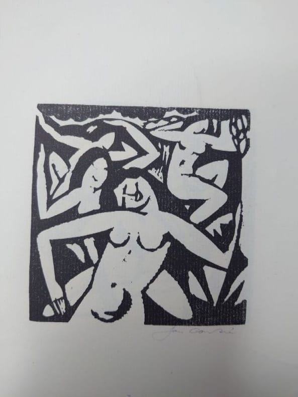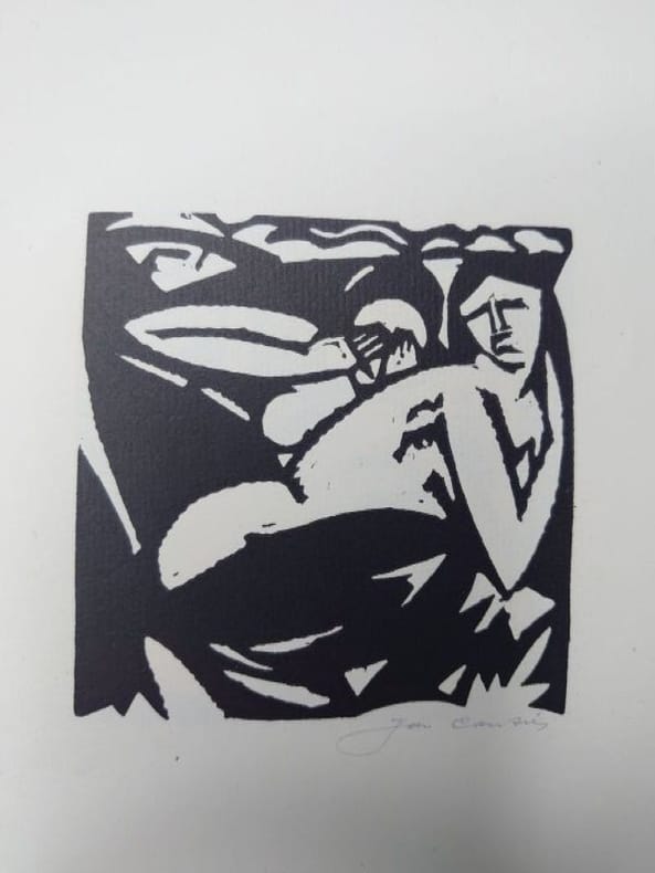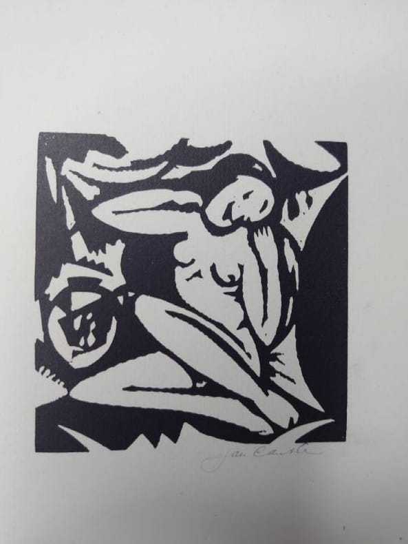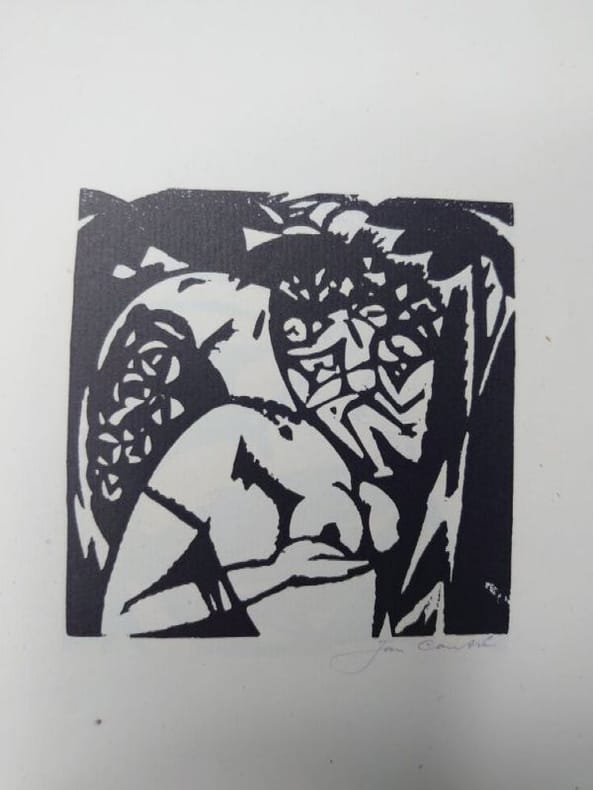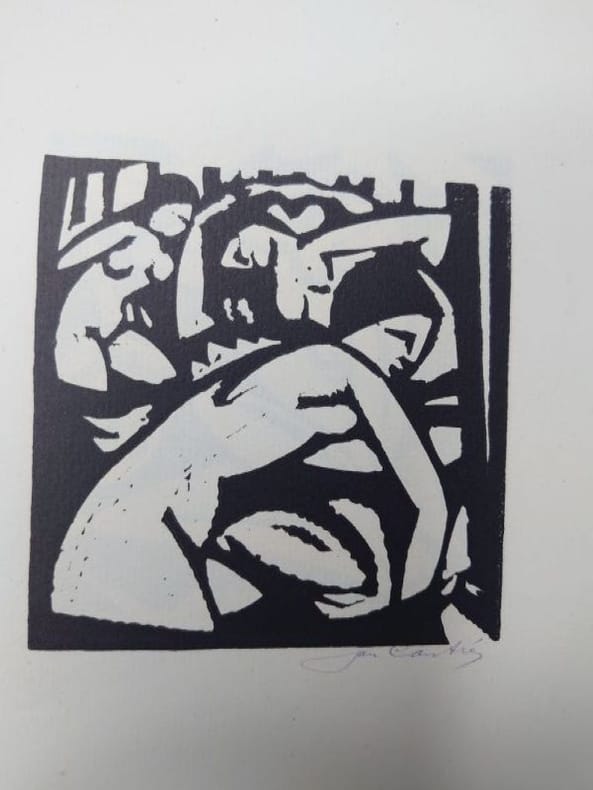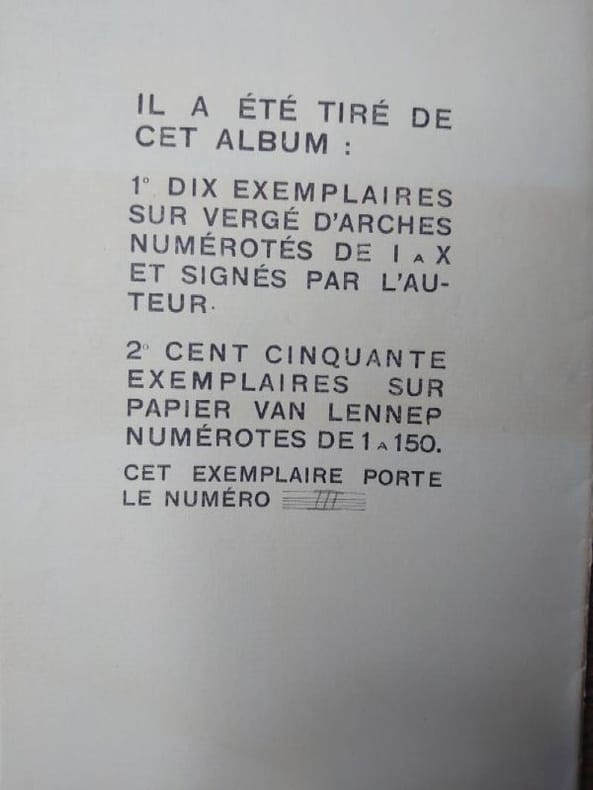Tirage à 10 exemplaires sur vergé d'Arches et 150 sur van Lennep. Celui-ci sur van Lennep (n° 80). Rare suite de gravures sur bois expressionnistes. La très fragile couverture comporte de nombreuses déchirures, papier des planches un peu froissé.