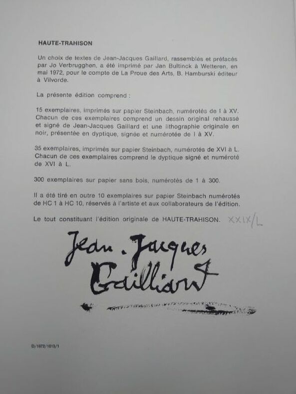 1972 La Proue des Arts, B. Hamburski éditeur à Vilvorde, 1972. 24,5 x 19,5 cm, 88 pp. En feuilles sous chemise imprimée. Très bel état. Édition originale, un des 35 exemplaires numérotés sur papier Steinbach, comprenant le dyptique signé et numéroté.
