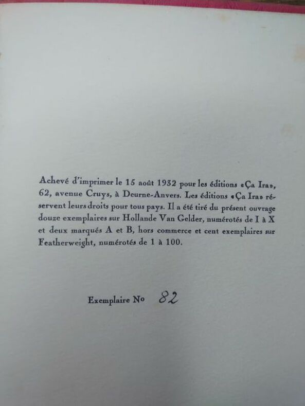 zz, 2. Anvers ( Antwerpen ) , Ça Ira , 1932 , petite in-4°, 19,5 x 14 cm, 35 pp , exemplaire numéroté 11/100, sur papier Featherweight, tiré à 112 exemplaire. Broché, couverture originale imprimée de l'éditeur. Exemplaire non copué, non ouvert.