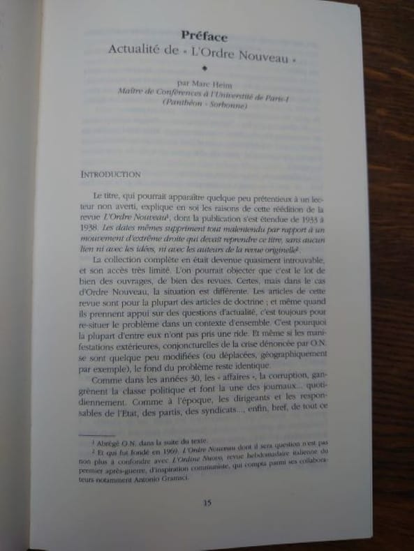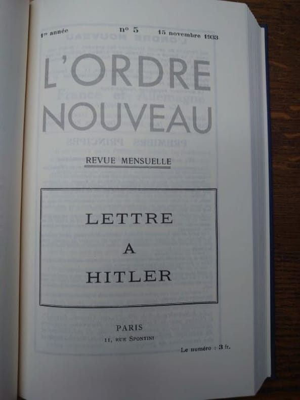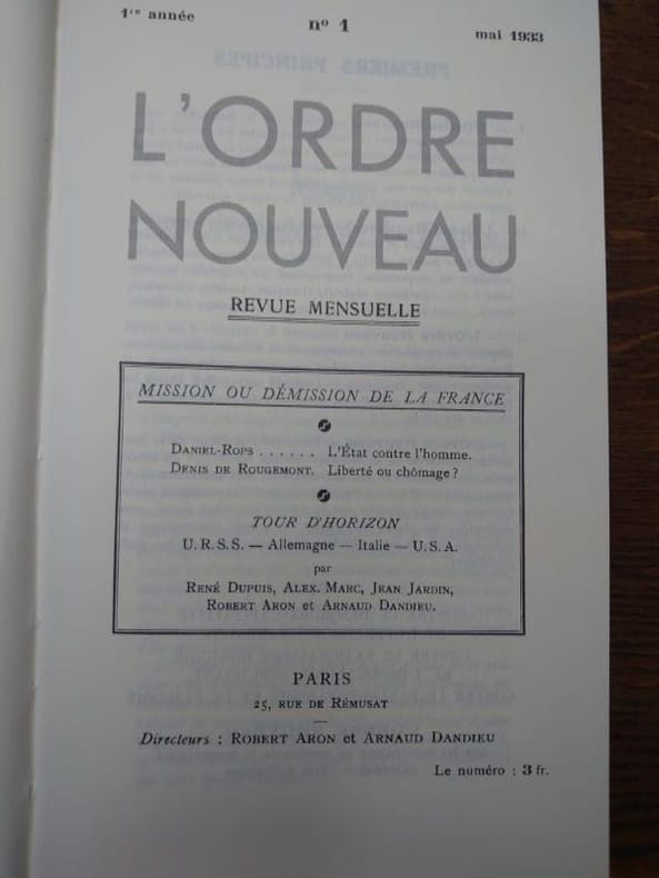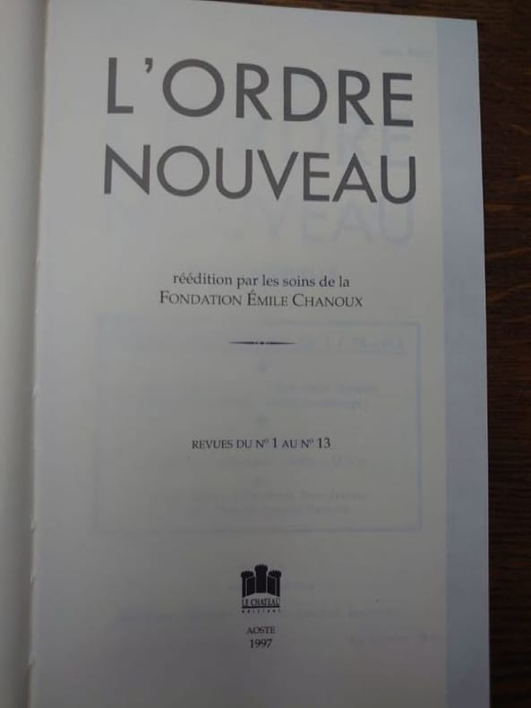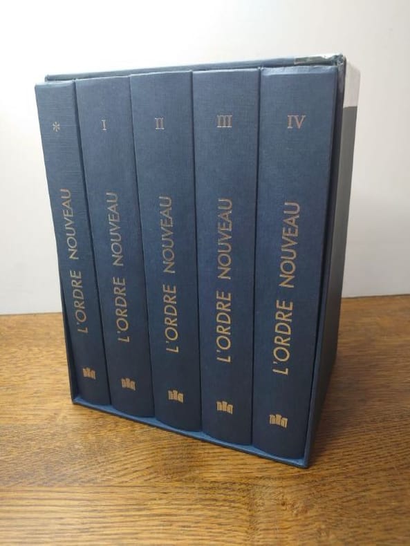 1997 Le Château Éditions, Aoste, 1997. 24 x 14,5 cm, cinq volumes pleine toile d'éditeur sous étui. Une inscription au stylo sur chaque volume, étui réparé mais solide, sinon bel exemplaire. Quatre volumes de réédition intégrale de cette revue et un volume d'index et de commentaires. Les années 1930 représentent un tournant dans l’histoire de l’Europe occidentale. Face à une crise profonde qui touche tous les champs de la société, des hommes jeunes se réunissent autour d’Alexandre Marc et Arnaud Dandieu sur les problèmes de la société de leur temps. Il s’agit d’abolir le « désordre établi » et d’accorder dans le respect de la diversité, contre les dictatures de droite et de gauche, contre l’État monstre froid, contre le matérialisme capitaliste et marxiste, sa juste place à l’Homme libre. Ces impératifs spirituels globaux sont assortis de desseins pratiques fondés sur la méthodologie dichotomique, proche de la doctrine proudhonienne. Ainsi, se réclamant du fédéralisme personnaliste ils proposent l’organisation en communautés – non hiérarchisées et fédérées – au niveau privé et public et une réorganisation socio-économique en vue de l’abolition de la condition prolétarienne.« L’Ordre Nouveau » met en évidence le rôle essentiel de la personne, fondement de toute valeur. Au même titre que le groupe d’ « Esprit », ces non-conformistes sont à l’origine du personnalisme, base de la révolution spirituelle qu’ils réclament. La relecture de cette collection d’articles non seulement nous permet de mieux comprendre l’histoire, mais éclaire l’actualité d’une lumière différente. Le vide idéologique et la crise profonde que traversent nos sociétés ne sont pas des phénomènes nouveaux : de 1933 à 1938 des jeunes gens, venus d’horizons divers, les ont ressentis et ont essayé d’y remédier. Parmi eux : les catholiques Daniel-Rops et Paul Flamand, le maurassien Jean Jardin, l’ouvrier anarchiste Pierre Prévost, le mathématicien Claude Chevalley, le futur académicien Robert Aron, et le pionnier de l’idée fédérale Denis de Rougemont.
