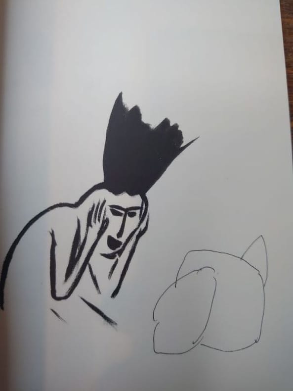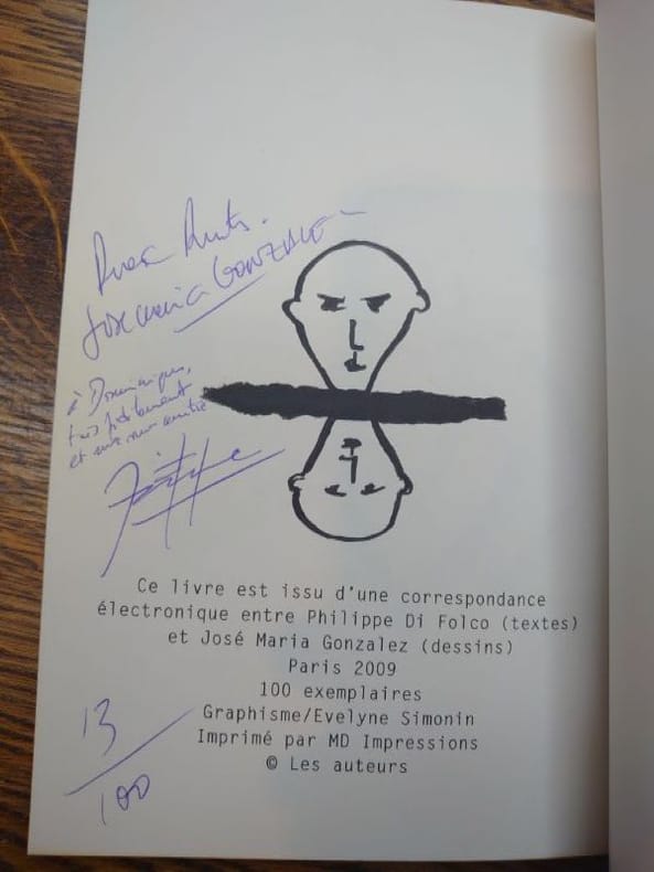 Paris, Les auteurs, 2009. 21 x 14 cm, non paginé. Bel exemplaire. Édition originale, tirage limité à 100 exemplaires numérotés. Double envoi autographe signé des auteurs à Dominique Noguez. Jose Maria Gonzalez et Philippe Di Folco ont édité ce livre reprenant leurs échanges d’email : le premier envoyait un dessin que le second « illustrait » en retour par du texte.