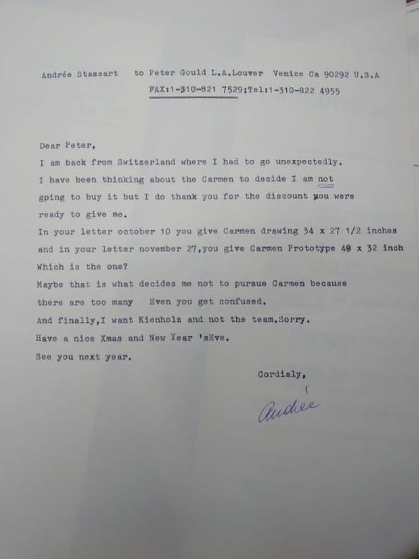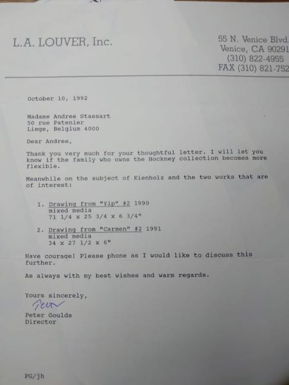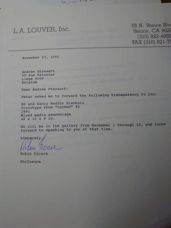 L.A. Louver, Veice, California. 31 x 23 cm, 68 pp. Broché en bon état. Joints : deux lettres tapuscrites signées des galeristes à une cliente et la réponse de cette cliente, à propos de l'éventuel achat d'une oeuvre, accompagnées d'une reproduction photographique d'une oeuvre "Drawing from Carmen".