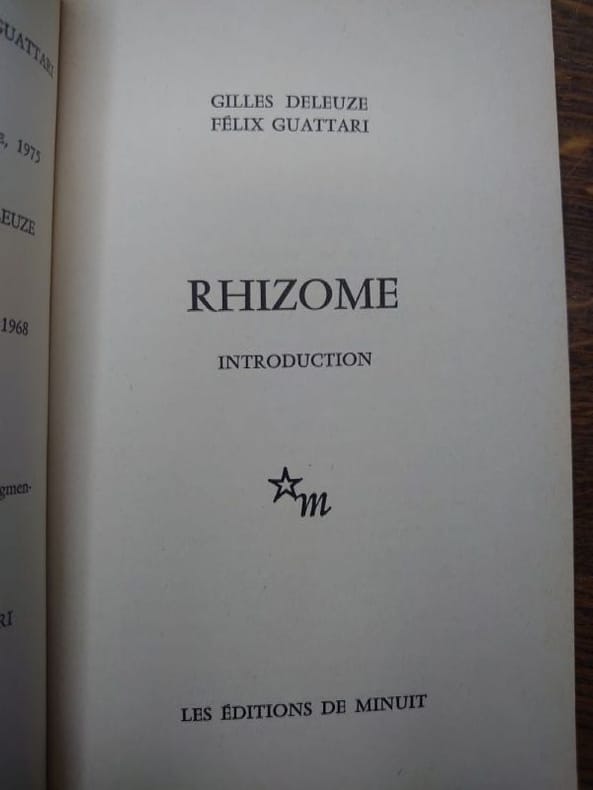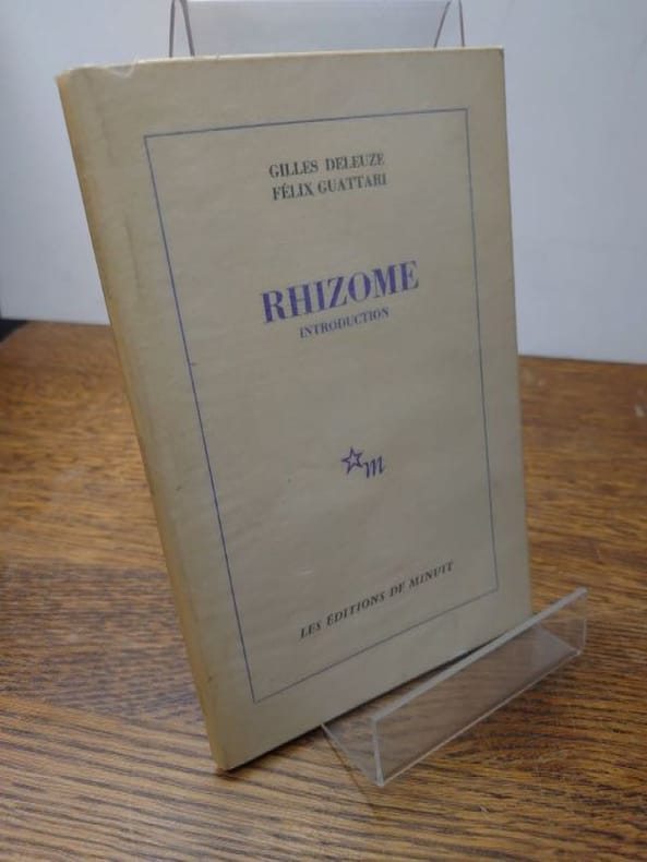 Édition originale brochée (185x120mm), en très bonne condition, 74 pages. Tirage numéroté (25/92) sur Bouffant sélect, seul tirage réservé à la Librairie des Éditions de Minuit, avec quelques exemplaires hors-commerce. Publié en 1976, Rhizome est le point de passage entre les 2 tomes de Capitalismes et schizophrénie : L'Anti-Oedipe (1972) et Mille Plateaux (1980). Les auteurs, Gilles Deleuze (1925-1975) et Félix Guattari (1930-1992), tous deux philosophes, confèrent au rhizome une '' portée aussi métaphysique que politique''. En effet, ''alors que le rhizome prolifère horizontalement, l'arbre -à l'inverse- se développe selon un modèle vertical, hiérarchique (archè)''. Processus qui s'accorde avec celui de nomadisation. Exemplaire en très bonne condition.