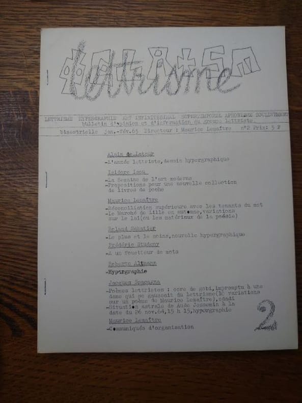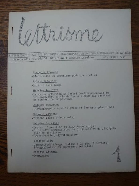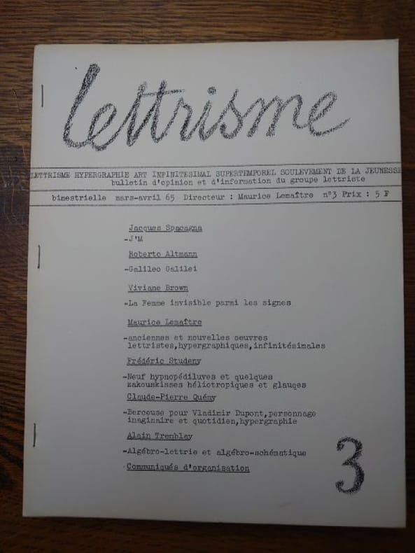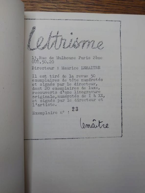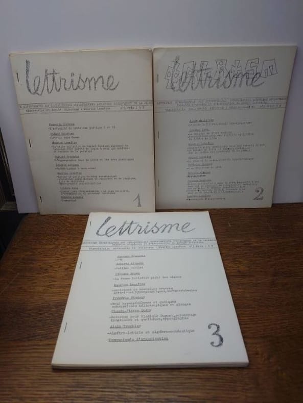 Paris, directeur Maurice Lemaitre. Les trois premiers numéros de ce bulletin, 27 x 21 cm, plaquettes agrafées non paginées. Le numéro 1 est un des 50 exemplaires numérotés de tête et signé par Maurice Lemaître. Beaux exemplaires.