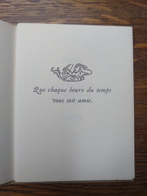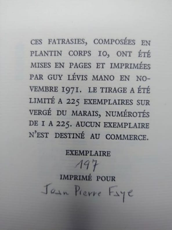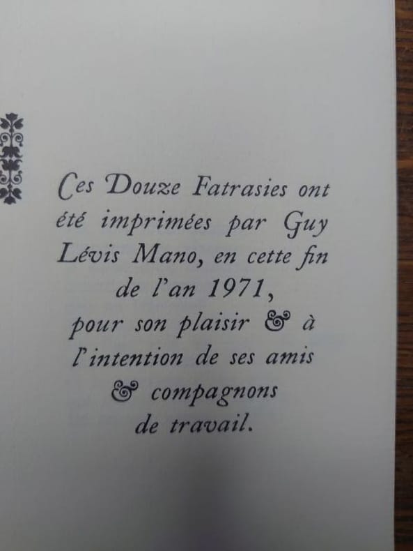 GLM, 1971. 12,5 x 9,5 cm, non paginé. en feuilles sous couverture rempliée, couverture partiellement insolée sinon bon exemplaire. Un des 225 exemplaires numérotés sur vergé, non mis dans le commerce. Exemplaire nominatif.