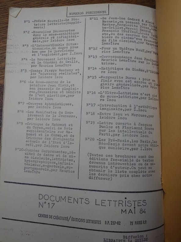 Documents lettristes N°17. Mai 84. 30 x 21 cm, 23 pp. Plaquette agrafée en bon état. Texte paru initialement en 1956, dans le numéro 7 de la revue Front de Jeunesse.
