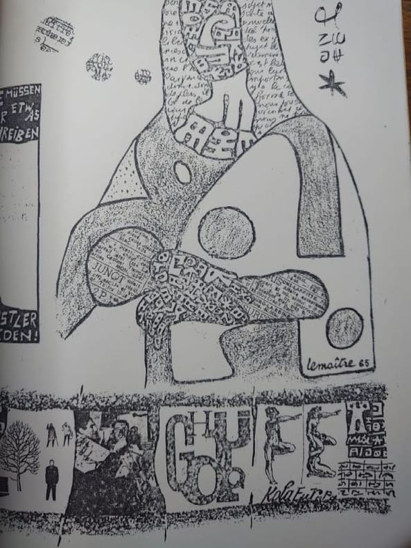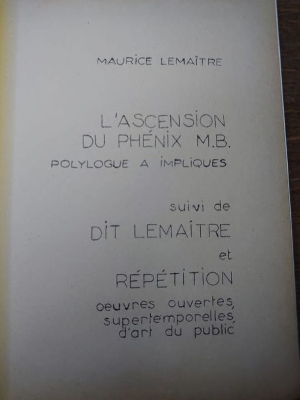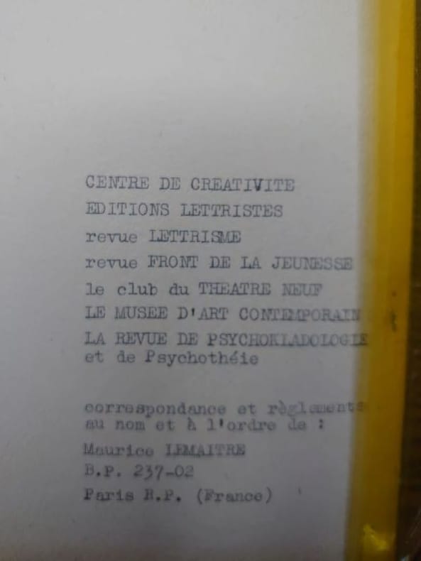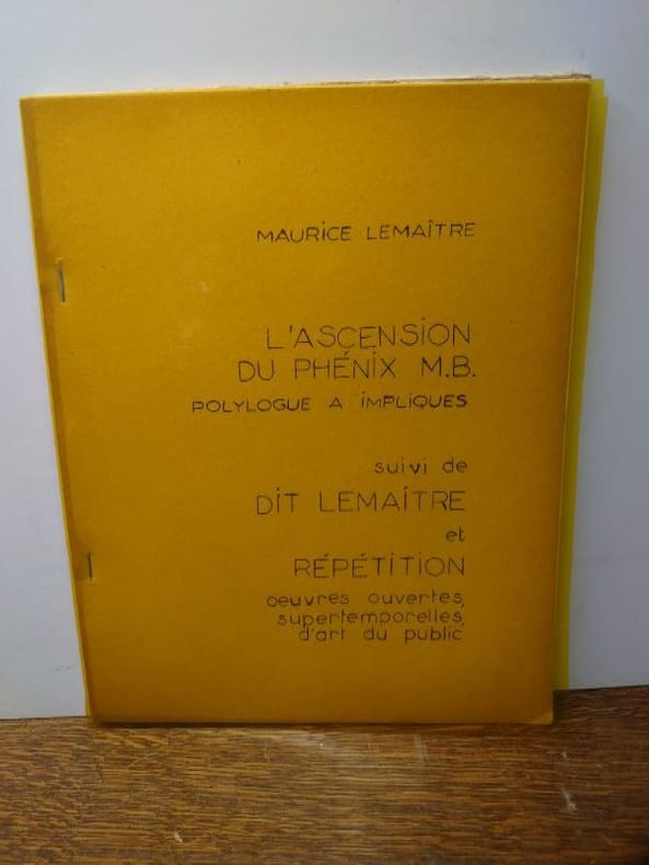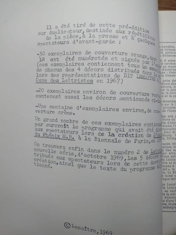 Centre de créativité, 1969. 27 x 21 cm, 42 pp. Pages dactylographiées et ronéotypées, couvertures agrafées. Rare exemplaire de cet ouvrage rassemblant plusieurs textes de Maurice Lemaître suivis d'un catalogue des publications lettristes , exemplaire non numéroté, bon état. Tirage limité a environ 100 exemplaires.