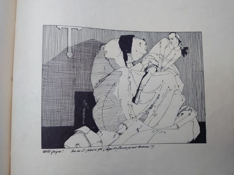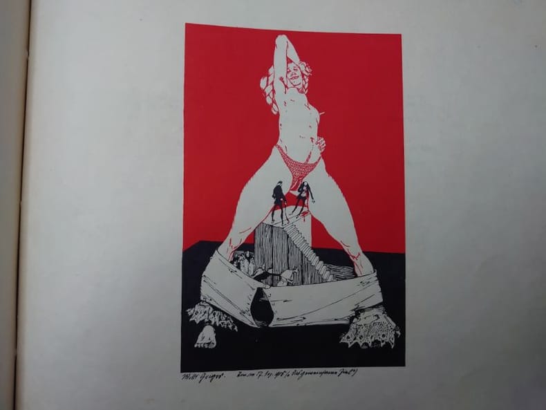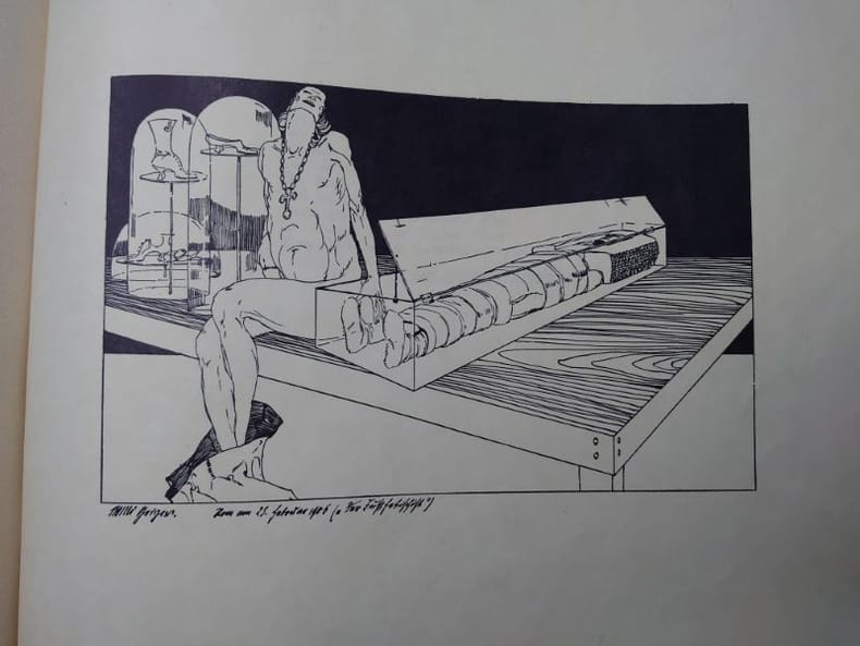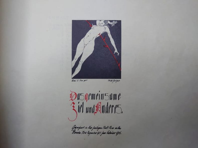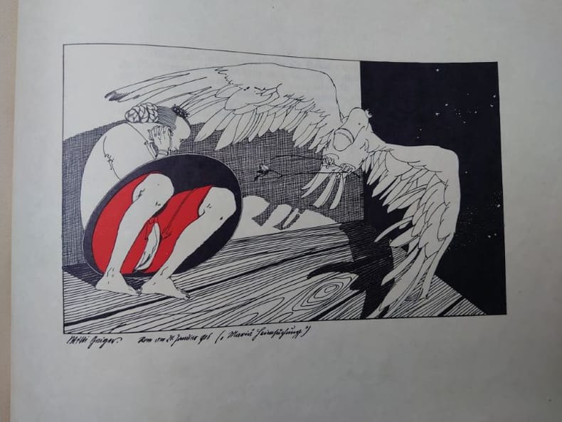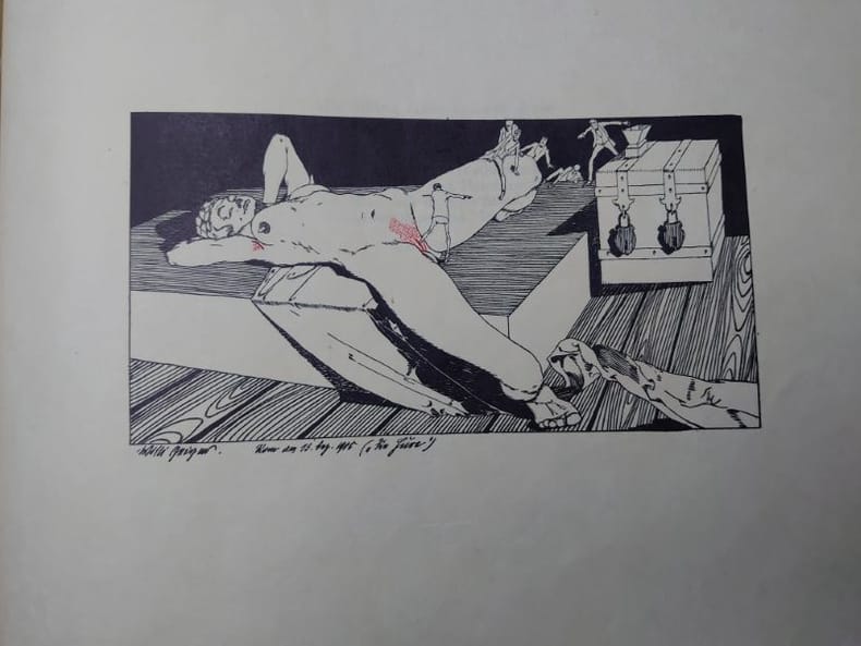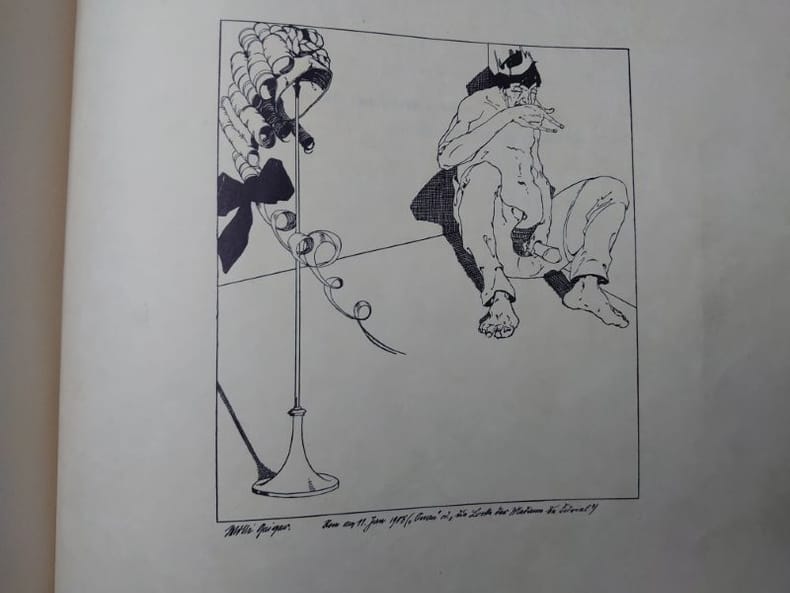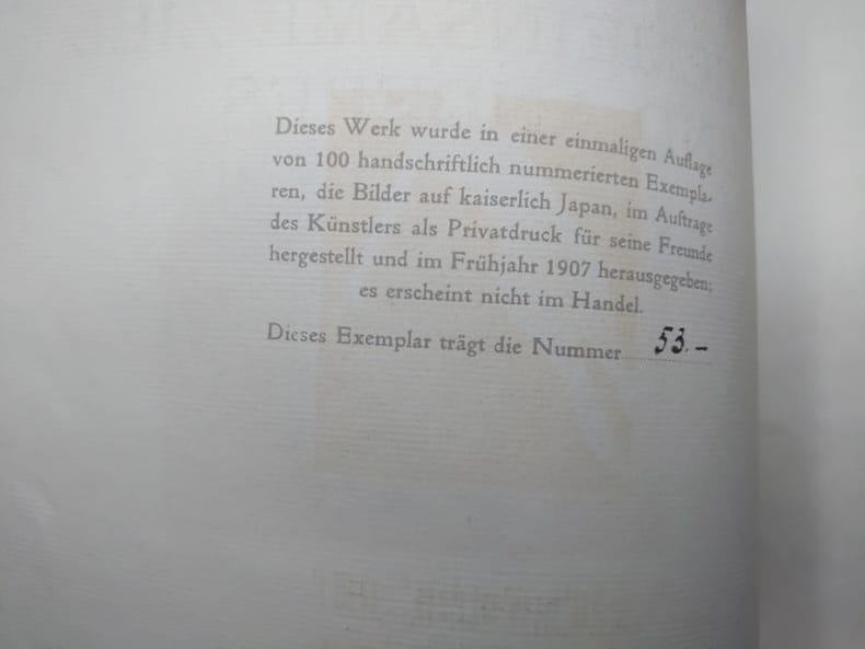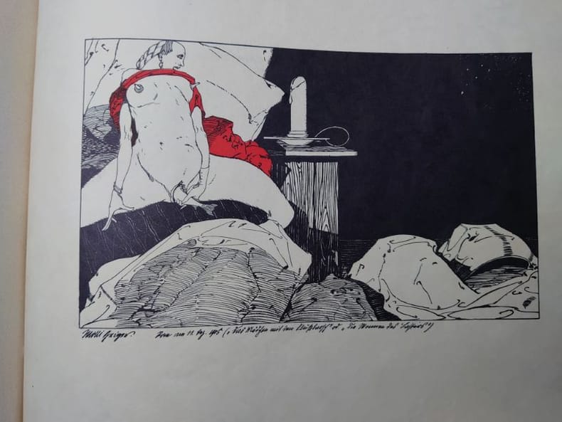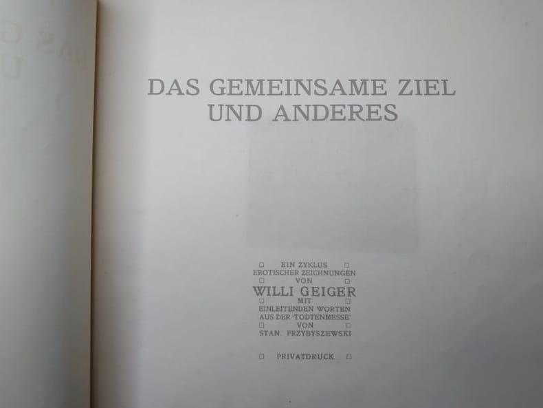 Une série de dessins érotiques […] avec une introduction tirée de la Messe des morts de Stan[islaw] Przybyszewski. Sans lieu ni éditeur [1907]. Avec douze planches, dont cinq en deux couleurs. Brochure originale avec reliure à cordon. Impression privée à 100 exemplaires numérotés. Ces dessins érotiques ont été réalisés en 1905 à Rome. Avec « Les métamorphoses de Vénus », ce cycle est considéré comme l'oeuvre majeure de Geiger. Avec une introduction de Stanislaw Przybyszewski et des aphorismes et vers de Franz Blei, Conrad Fiedler, Johann Wolfgang von Goethe, E. et J. Goncourt, Christian Günther, Friedrich Schlegel, Otto Weininger, entre autres. Les dessins sont sur papier japon, les feuilles de texte sur papier à la cuve. Couverture légèrement usée, quelques salissures sur les pages, gravures en bon état. Provenance : ex libris de Piero Lorenzoni contrecollé sur la page de garde.