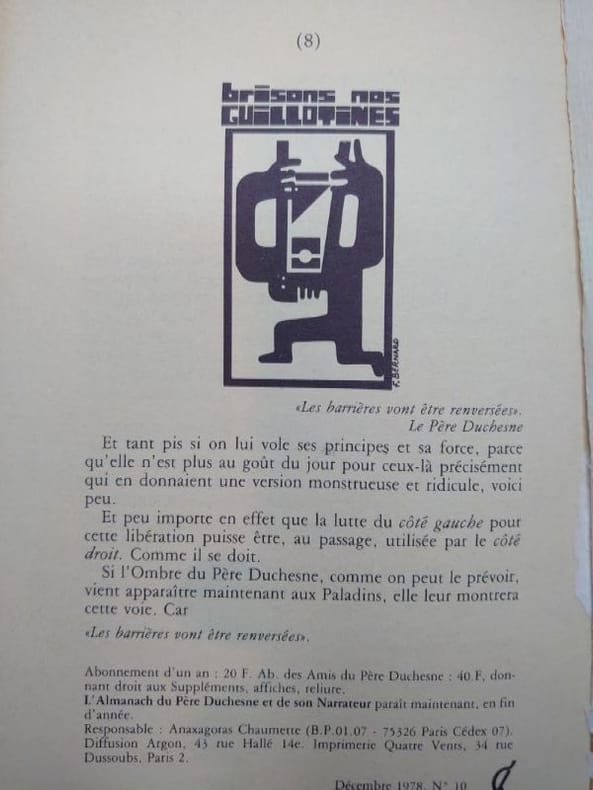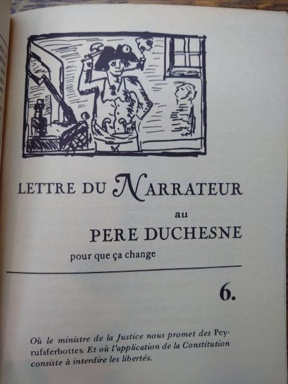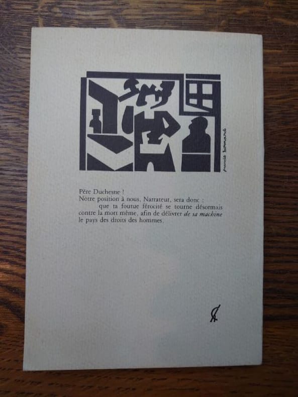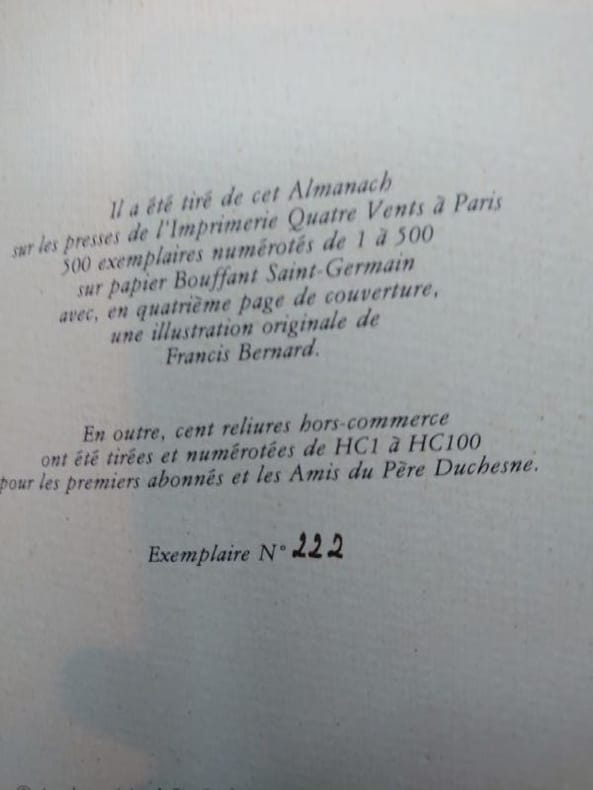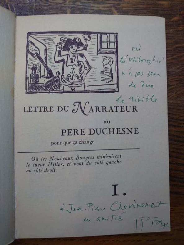 18 x 12,5 cm, 10 numéros, de 7 pages chacun, de la Lettredu Narrateur au Père Duchesne pour que ça change. Édition originale, un des 500 ex. num. sur papier Bouffant Saint-Germain. Envoi autographe signé de Jean-Pierre Faye à Jean-Pierre Chevènement.