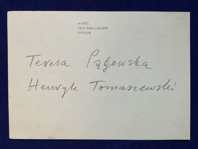 1510 15 x 10,5 cm. Carte imprimée manuellement (pochoir?).Belle carte typographique signée au crayon au verso Teresa Pagowska et Henryk Tomaszewski, respectivement peintre et figure emblématique de l'affiche moderne polonaise.