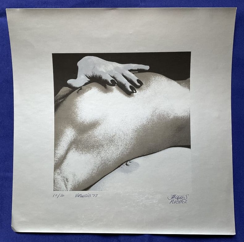 1977 Venezia, [19]77. 30 x 30 cm. Une planche en papier fort glacé argenté, photographie "colour trap". Planche érotique numérotée 10/80, datée et signée de la main de l'artiste. La technique lui est propre, qu'il nomma "colour trap" : il s'agit d'un tirage photographique préalablement trafiqué.