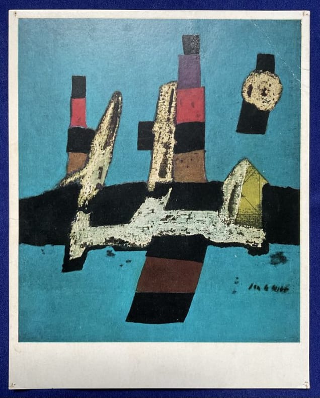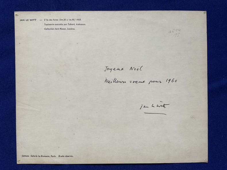 1960 Paris, Éditions Galerie la Demeure, 1960. 14,5 x 18,5 cm. Carte illustrée en offset. Pli sur un coin et petits trous de punaises. Carte autographe signée illustrée par la photographie d'une composition de l'artiste exécutée en tapisserie par l'atelier Tabard d'Aubusson. Jan Le Witt, designer et peintre expérimenta divers media dans ses oeuvres personnelles, à travers des collaborations avec l'opéra (costumes), des verriers de Murano ou encore les tapissiers de l'atelier Tabard.