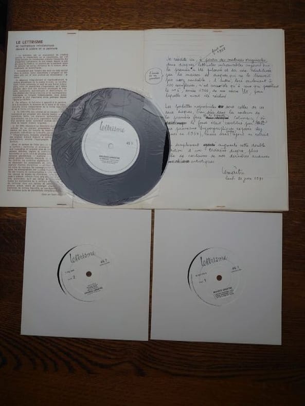 Editions Lettristes. Lettrisme. Mensuel. Nouvelle série n° 24 août 1971. 27 x 20,8 cm, pochette contenant un texte de 4 pages et 3 disques 45 tours (texte et poésie sonore de Maurice Lemaitre) (agrafes rouillées et pochette légèrement salie sinon bon état). Réédition sur les matrices originales de deux disques introuvables le premier a été pilonné en 1958 le second a été tiré à 100 ex. Le troisième disque contient "certaines de nos dernières audaces artistiques" et est donc original.