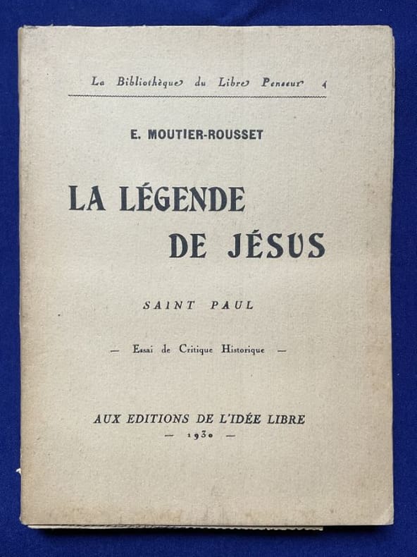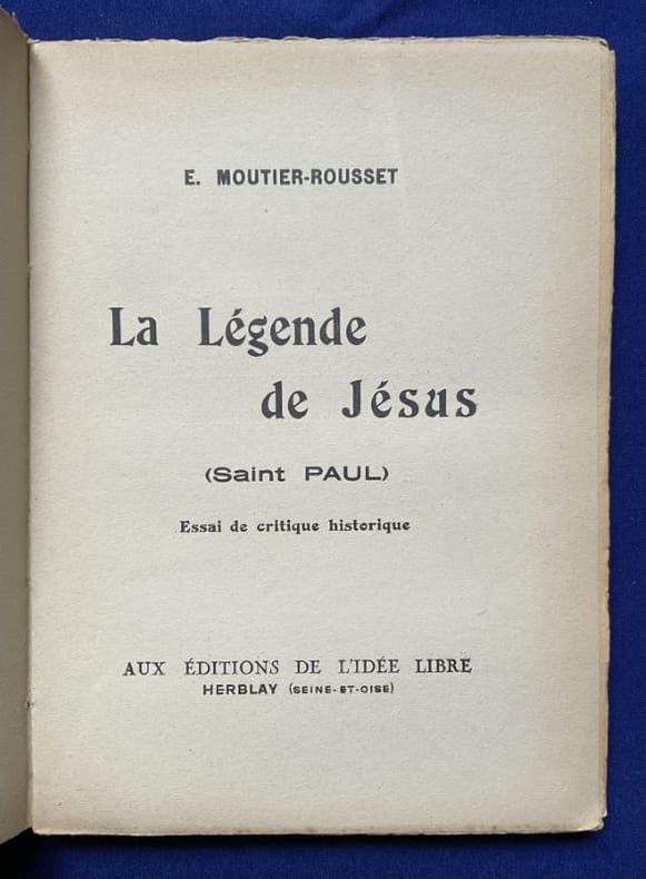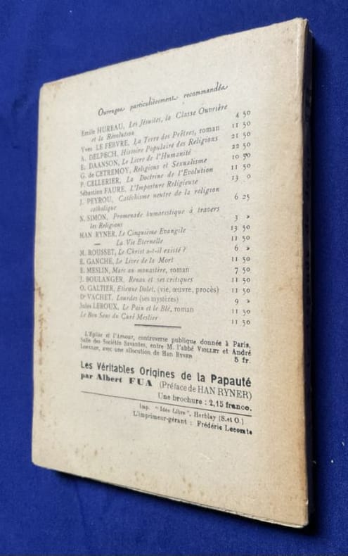 1980 Herblay, aux Éditions de l'Idée libre, La Bibliothèque du libre penseur 4, 1930.19,5 x 14,5 cm, 140-[1] pp. Broché, couverture imprimée d'édition. Quelques rousseurs sur la couverture sinon bel état.Édition originale et probablement la seule existante de cet ouvrage anticlérical. Les éditions de l'Idée libre sont apparentées à la revue du même nom, anarchiste libertaire. L'absence de toute information sur l'auteur suggère un pseudonyme.