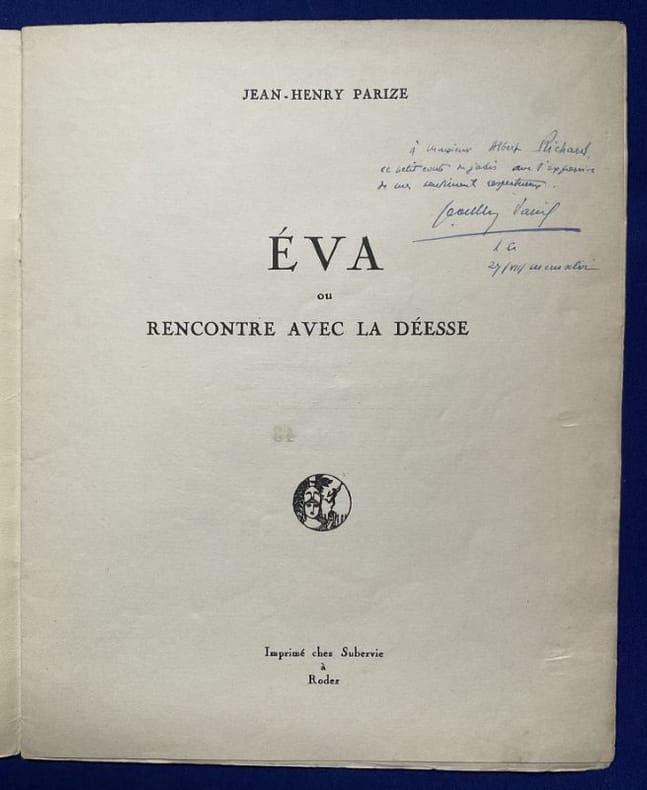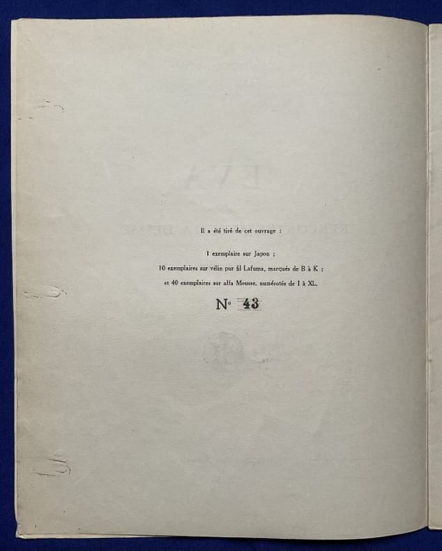 Rodez imprimé chez Subervie, 1939. 28,5 x 23 cm, non paginé, [16] pp. Plaquette agrafée, couverture imprimée d'édition. Quelques frottements sur la couverture, petites marques de rouille sur la page de justification, bel état général. Édition originale et probablement la seule existante, avec un envoi autographe signé de l'auteur. Cet exemplaire porte le numéro 43, qui ne correspond à rien de ce qui est annoncé à la justification : 1 Japon, 10 vélin pur fil Lafuma marqués B à K et 40 alfa Mousse numérotés I à XL.