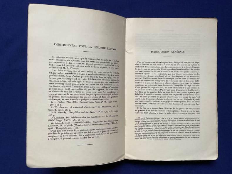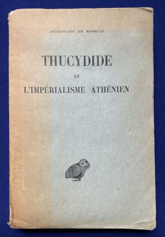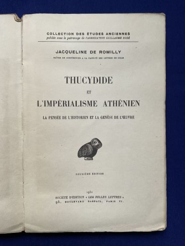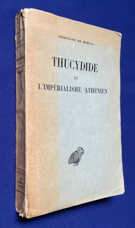 Paris, Société d'édition "Les Belles lettres", collection des études anciennes (Guillaume Budé), 1951. 25 x 16,5 cm, 326-[1] pp. Broché, couverture imprimée d'édition en partie insolée, petits manques aux coiffes, très bon état intérieur. Seconde édition de la thèse de Jacqueline de Romilly, très rare et dont le texte n'est plus réédité. L'oeuvre de Thucydide accompagna la brillante helléniste dans toute sa carrière ; outre cette thèse et deux autres ouvrages, elle consacra près de 20 ans à la traduction de la Guerre du Péloponnèse. Petite étiquette ancienne de la librairie Gibert Joseph au premier contre-plat.