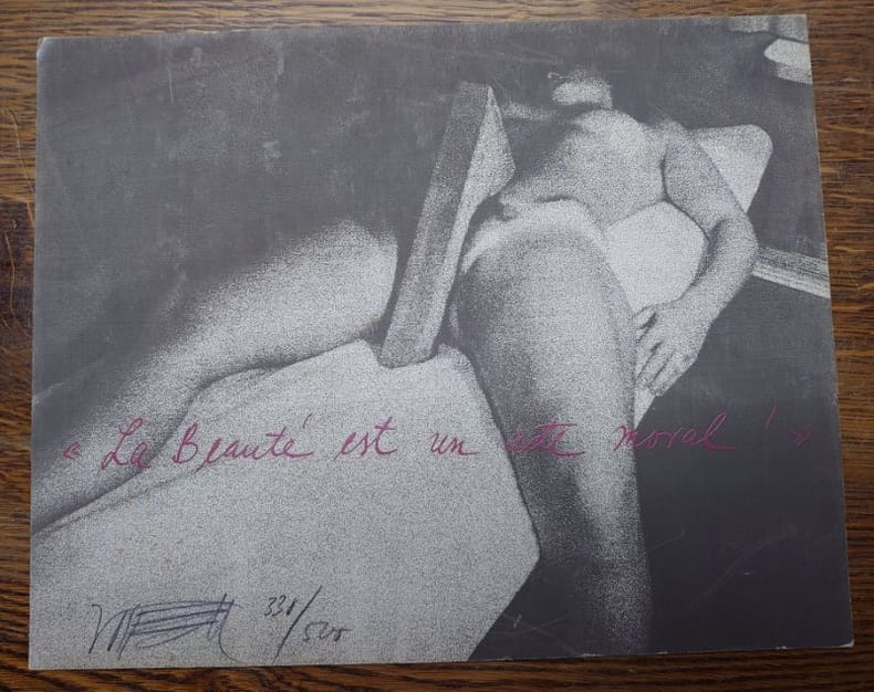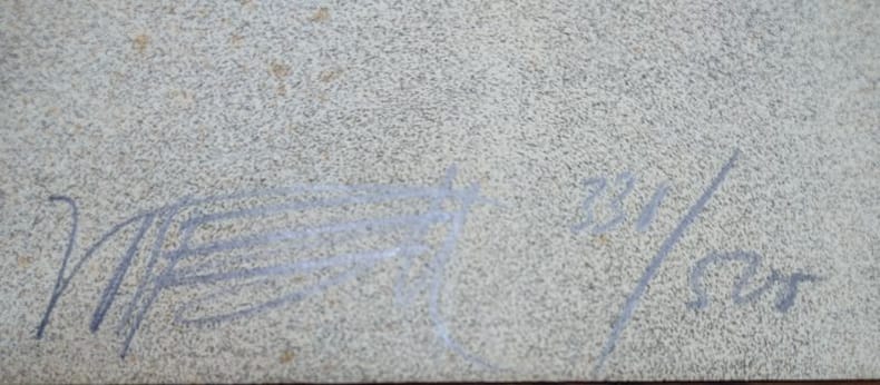 Lithographie originale signée et numérotée 480/500 au crayon. Le titre est imprimé en vitrophanie rouge (impression en relief). Coins légèrement cornés et rousseurs au dos sinon bel exemplaire. Wolf Vostell est un artiste allemand né à Leverkusen le 14 octobre 1932, mort à Berlin en 3 avril 1998. Il est peintre et sculpteur. Il est également considéré comme l'un des pionniers de l’installation, de l’art vidéo, de l’happening et du mouvement Fluxus.