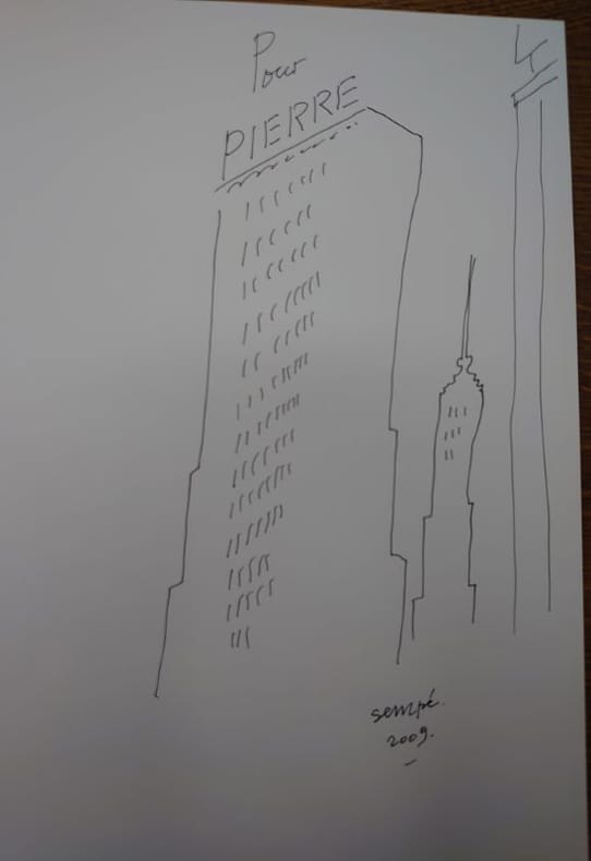 2009 Éditions Denoël / Martine Gossieaux, 2009. 32 x 23,5 cm, non paginé, environ 300 pp. Broché, couverture rempliée. Bel exemplaire.Envoi et dessin autographe signé de Sempé.