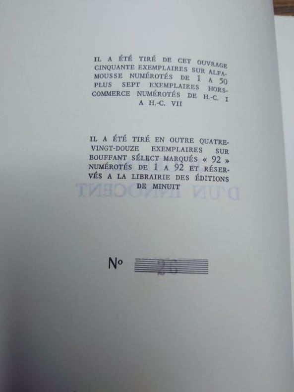Paris, Les Éditions de Minuit, 1976. 19 x 14 cm, 273 pp. Broché, bel exemplaire non coupé. Édition originale, un des 50 exemplaires numérotés sur Alfa-mousse.