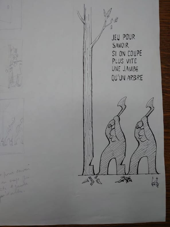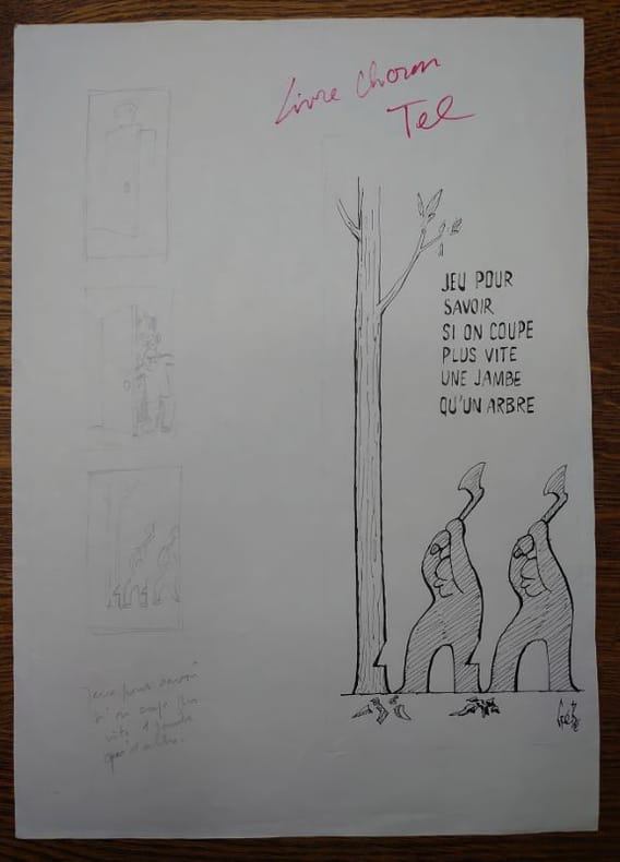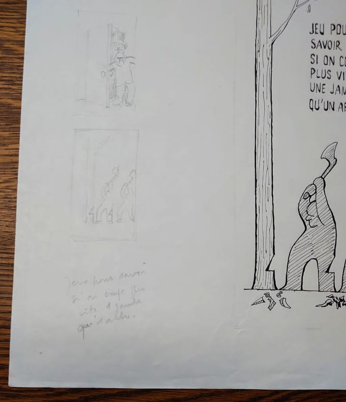 32 x 22,5 cm, encre originale signée. Et sur le côté trois esquisses au crayon. Ce dessin a été publié dans l'ouvrage Les jeux de con du Professeur Choron, 1971.