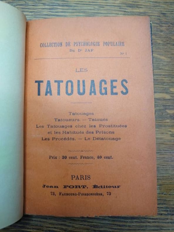 1900 Jean Fort, Paris s. d. [circa 1900]. Collection de psychologie populaire. N°1. 15,5 x 10 cm, 123 pp. et 15 pp. de catalogue in fine. Relié demi chagrin, dos lisse, titre doré en long, couvertures conservées. Reliure usée mais solide, frottements et épidermures. Insérés trois articles de presse sur les tatouages.