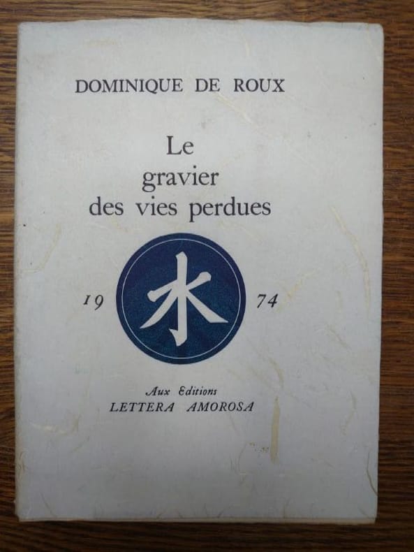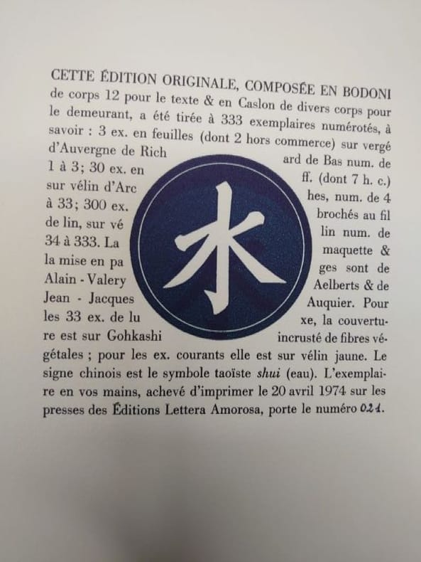 Aux Éditions Lettera Amorosa, 1974. 22 x 16 cm, non paginé. en feuilles sous couverture rempliée. Bon exemplaire. Édition originale, un des 30 ex. num. sur vélin d'Arches, la couverture est sur Gohkashi incrusté de fibres végétales. Le signe chinois est le symbole taoïste shui (eau). Signature manuscrite sur la page de garde (D. de Roux?).