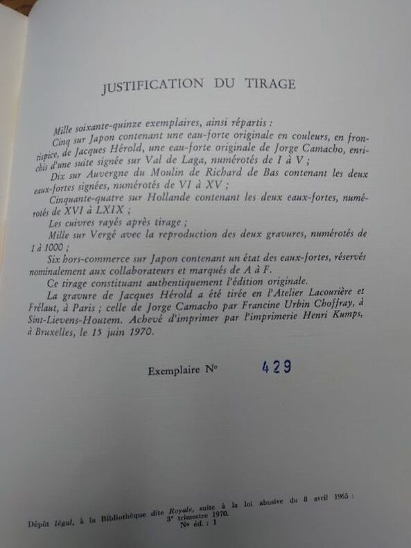 1970 Bruxelles, 1970. 25 x 17,5 cm, 68 pp. Broché, couverture légèrement usée sinon bon exemplaire. Édition originale, un des 1000 ex. num. sur vergé. Envoi autographe signé de Jorge Camacho.