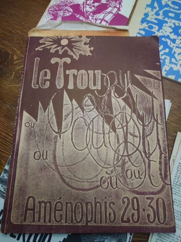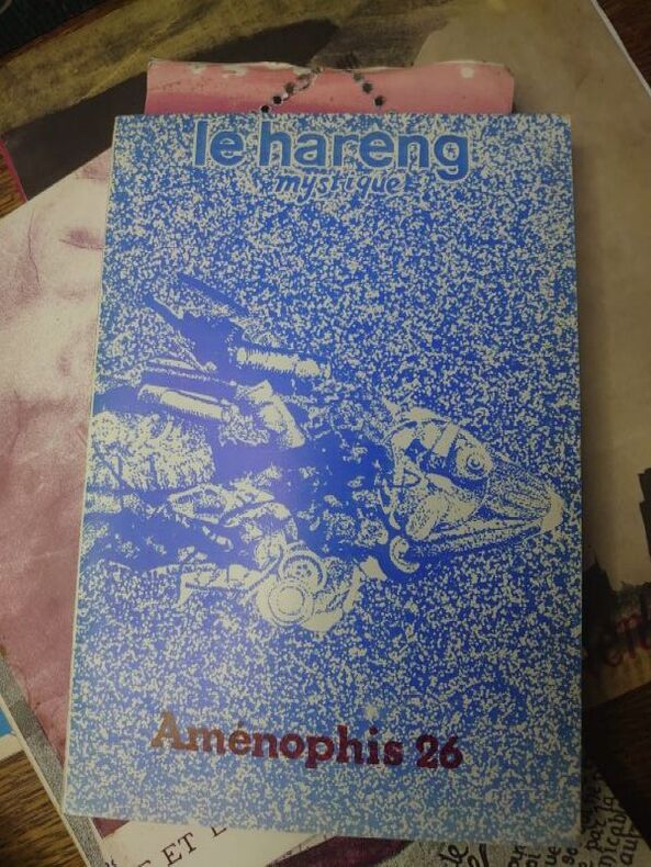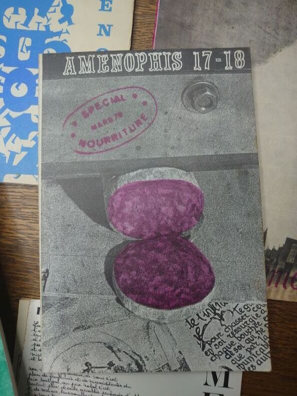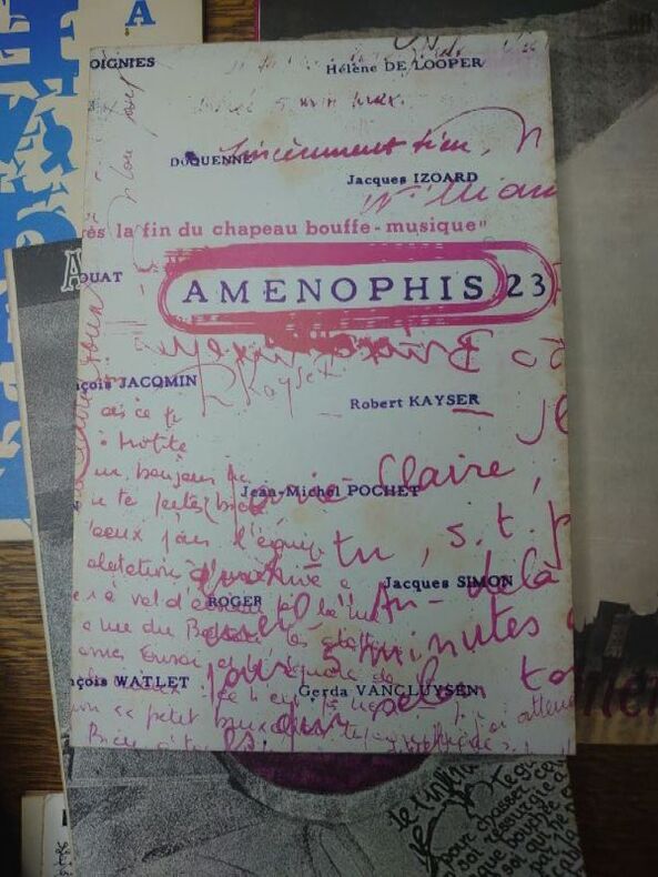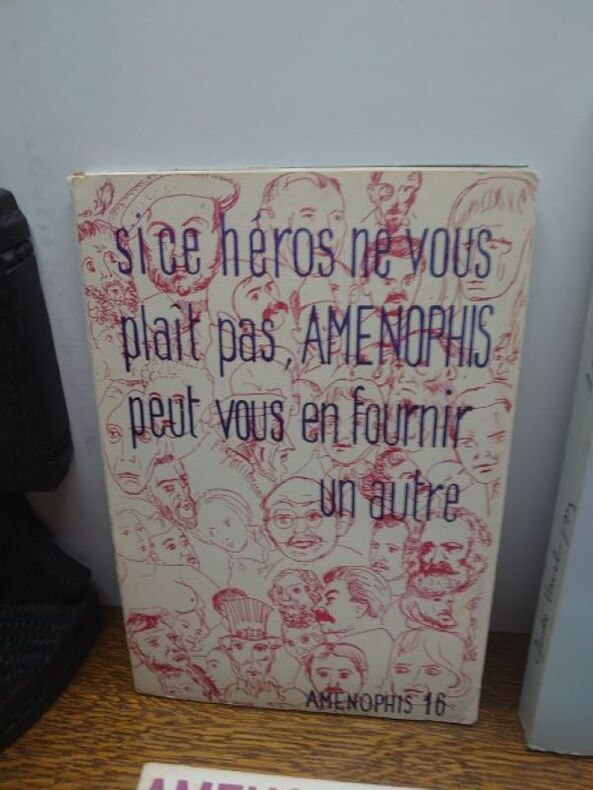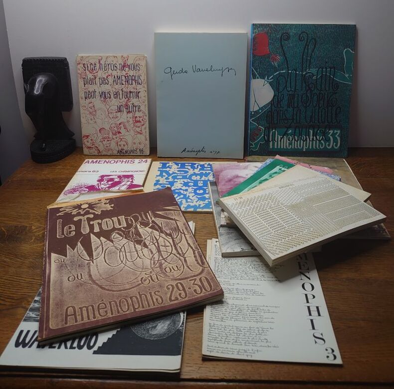 Nous avons : - Numéro 3. Sans date. Poème n°31 416. (couverture détachée). - Numéro 9. Octobre 1970. - Numéro 16. Décembre 1976. Si ce héros ne vous plaît pas, Amenophis peut vous en fournirun autre. - Numéro 17-18. Mars 1979. Spécial nourriture.- Numéro 21. Juillet-août-septembre 1980. - Numéro 22. 1980. Le cancer. - Numéro 23. 1981. - Numéro 24. Mars 1983. Les champignons. - Numéro 25. Juin 1983. On lui a tout enlevé et elle ne se révolte pas.- Numéro 26. Novembre 1986. Le hareng mystique. Complet du signet en couleurs de Miguel Fernandez-Bravo. - Numéro 27-28. Mai-septembre 1984. - Numéro 29-30. Mars-juin 1985. - Numéro 31-32. Octobre 1985, janvier 1986. La dérive des continents. (dos abîmé). - Numéro 33. Février 1987. La main de ma soeur dans la culotte du zouave. - Numéro 37. Juin 1990. Numéro double. Gerda Vancluysen. - Numéro 38. Mars 1993. Waterloo. (couverture détachée). La revue trimestrielle Aménophis, "constituée d'une équipe hybride, qui ne sait pas bien ce qu'elle veut mais le veut fort !", fut créée par les artistes Marie-Claude Gouat, Robert Kayser et André Morlain en 1968. Elle s'arrêta en 1993 et compte 38 numéros dont chaque parution était accompagnée d'un événement (spectacle, concert ou exposition).