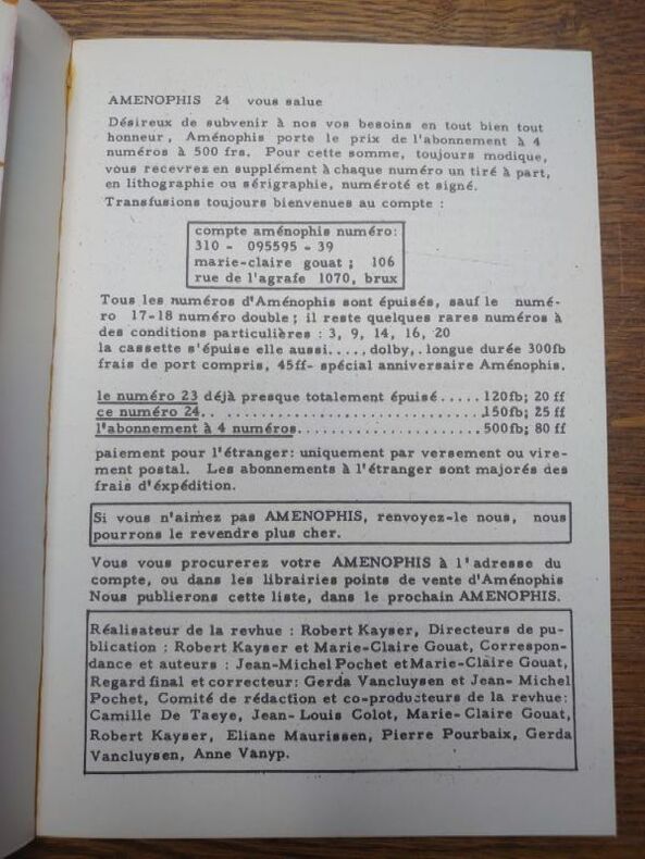 22,8 x 15,6 cm, 60 pp. Broché, couverture légèrement usée sinon bon état. Numéro hors série réservé aux abonnés avec un tiré à part, lithographie de Robert Kayser signée et numérotée 6/150. La revue trimestrielle Aménophis, "constituée d'une équipe hybride, qui ne sait pas bien ce qu'elle veut mais le veut fort !", fut créée par les artistes Marie-Claude Gouat, Robert Kayser et André Morlain en 1968. Elle s'arrêta en 1993 et compte 38 numéros dont chaque parution était accompagnée d'un événement (spectacle, concert ou exposition).