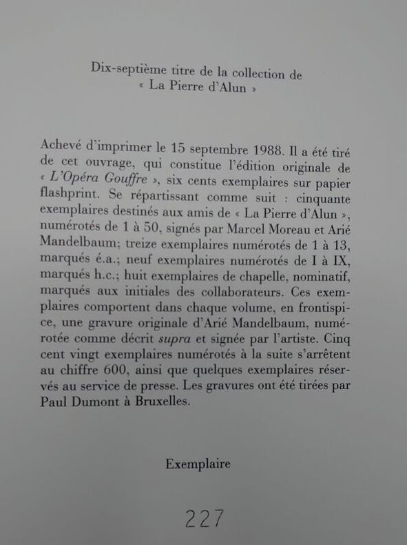 Éditions La Pierre d'Alun, 1988. 22,5 x 16,5 cm, 80 pp. En feuilles sous couverture à rabat. Couverture légèrement salie sinon bon exemplaire. Édition originale, un des 520 exemplaire numérotés sur papier flashprint.