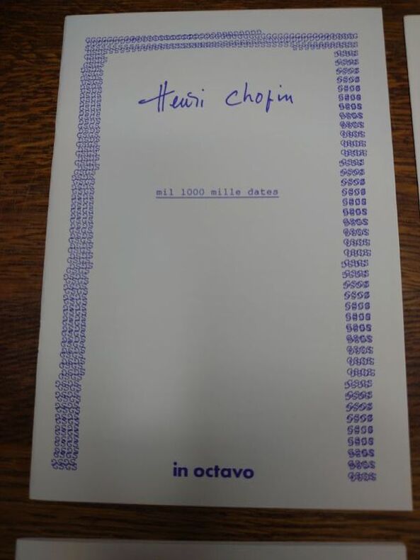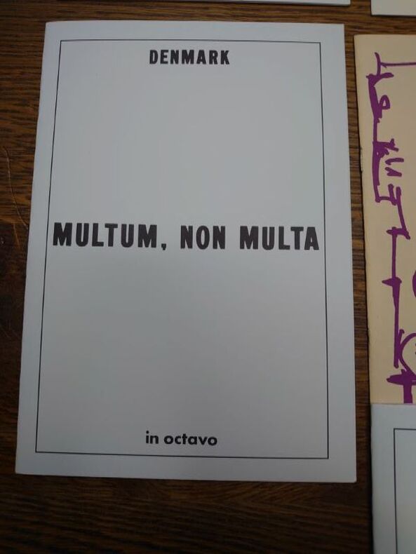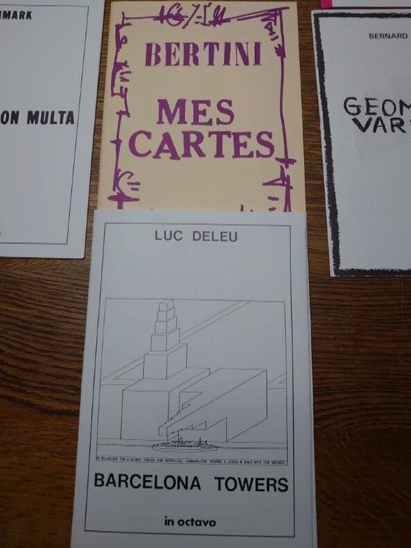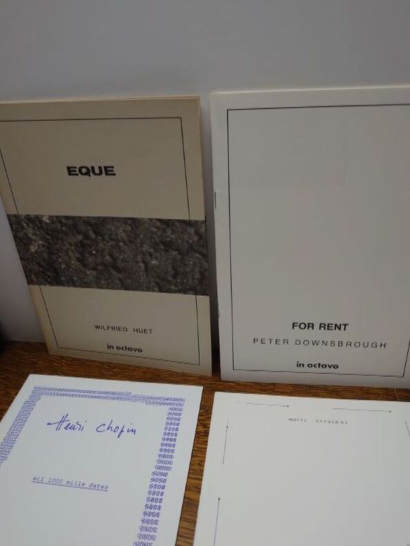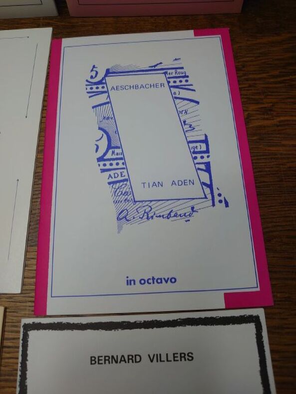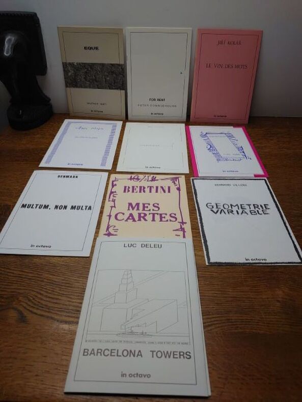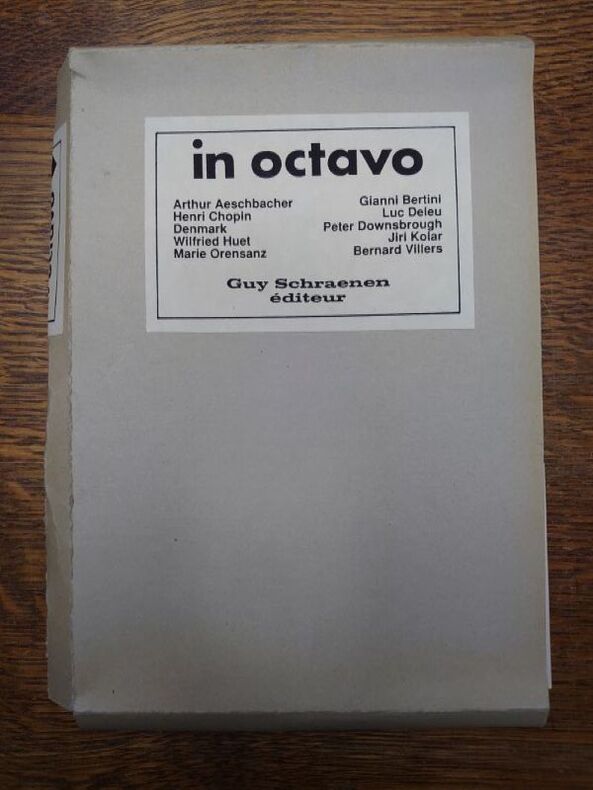 Anvers, Guy Schraenen, 1991. 10 plaquettes in-8 agrafées sous couvertures imprimées, sous étui avec étiquette de titre. Étui légèrement fatiguée sinon beaux exemplaires. Chaque ouvrage est en édition originale, tirée à 523 exemplaires, un des 500 numérotés du tirage courant. Série de dix livres d'artistes de la collection In octavo, réunis sous étui d'éditeur. Les dix auteurs sont : Arthur Aeschbacher, Gianni Bertini, Henri Chopin, Luc Deleu, Denmark, Peter Donwsbrough, Wilfried Huet, Jiri Kolar, Marie Orensanz et Bernard Villers.
